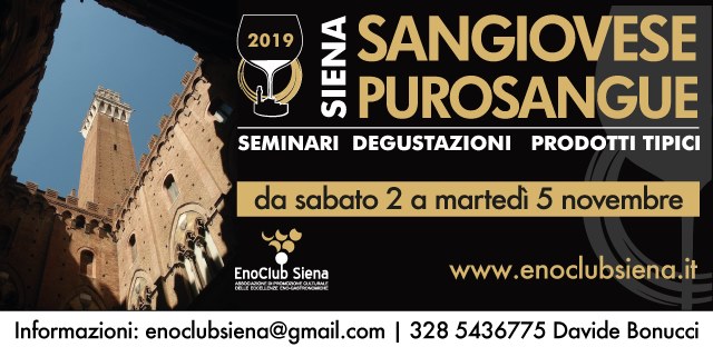SANGIOVESE PUROSANGUE A SIENA SABATO 2 E DOMENICA 3 NOVEMBRE 2019 15.00 – 19.30 Banchi di assaggio Sangiovese Purosangue con i produttori, apertura al pubblico. Magazzini del Sale - Palazzo Pubblico Piazza del Campo 1 La maratona del Sangiovese nella capitale del vitigno: degustazioni tematiche, conferenze, banchi di assaggio, seminari, incontri con gli operatori. 100… Continua a leggere Sangiovese Purosangue