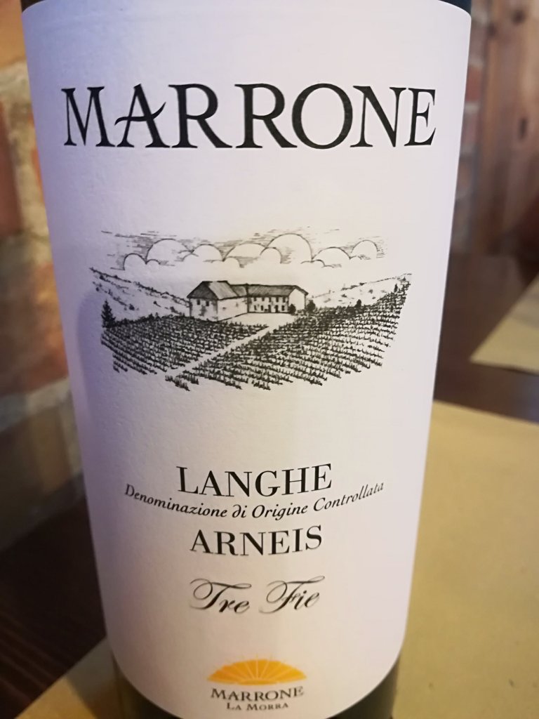 Arneis Langhe Tre Fie 2018 Az. Marrone, ottenuto con Arneis in purezza, si presenta nel calice con una bellissima tonalità giallo paglierino con leggeri riflessi che virano sul verdolino. Al naso libera eleganti e intensi sentori floreali e fruttati, di acacia, di pesca e di agrumi. Al gusto è piacevolmente fresco, di buona struttura e con una buona vena sapida, caratterizzato da una buona corrispondenza gusto-olfattiva e chiude con lunga persistenza.