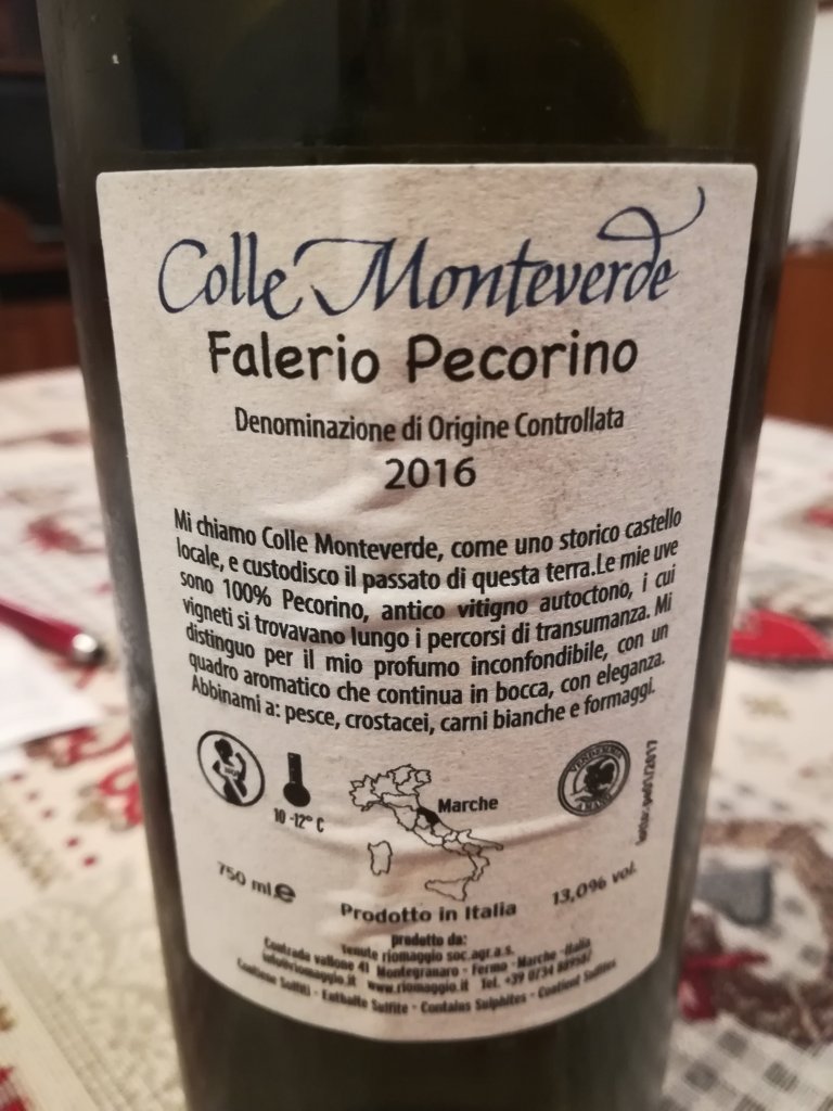 Colle Monteverde Falerio Pecorino Doc 2016 Az. Rio Maggio, ottenuto con Pecorino in purezza, si presenta nel calice con una bellissima tonalità giallo paglierino con riflessi che virano sul dorato, al naso sprigiona eleganti sentori floreali di gelsomino e di ginestra, fruttati di pesca bianca, albicocca, limone e bergamotto, al gusto è piacevolmente fresco, nonché sapido, prende uno slancio per un finale decisamente lungo. Degustazione del 3 ottobre 2020. Ho avuto modo di provare anche altri vini di questa azienda, sia bianchi che rossi. Grazie al mio enotecario di fiducia.
