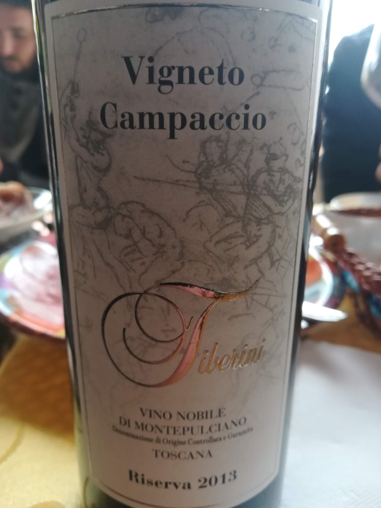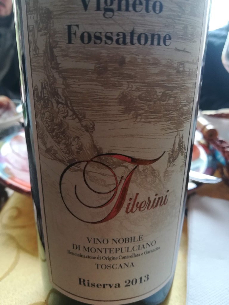 Vino Nobile di Montepulciano Riserva Vigneto Fossatone 2013, ottenuto con 90% Prugnolo Gentile, 5% Mammolo e 5% Canaiolo Nero, di un bellissimo colore rosso rubino con riflessi che virano sul granato, molto trasparente, al naso dipana eleganti sentori di frutti di bosco, prugna, cacao e tabacco che vanno a seguire una scia speziata con qualche accenno balsamico, al palato ti colpisce per la sua finezza, i tannini sono consistenti ma al contempo ben levigati, rimane in bocca a lungo, un vino davvero ben fatto.