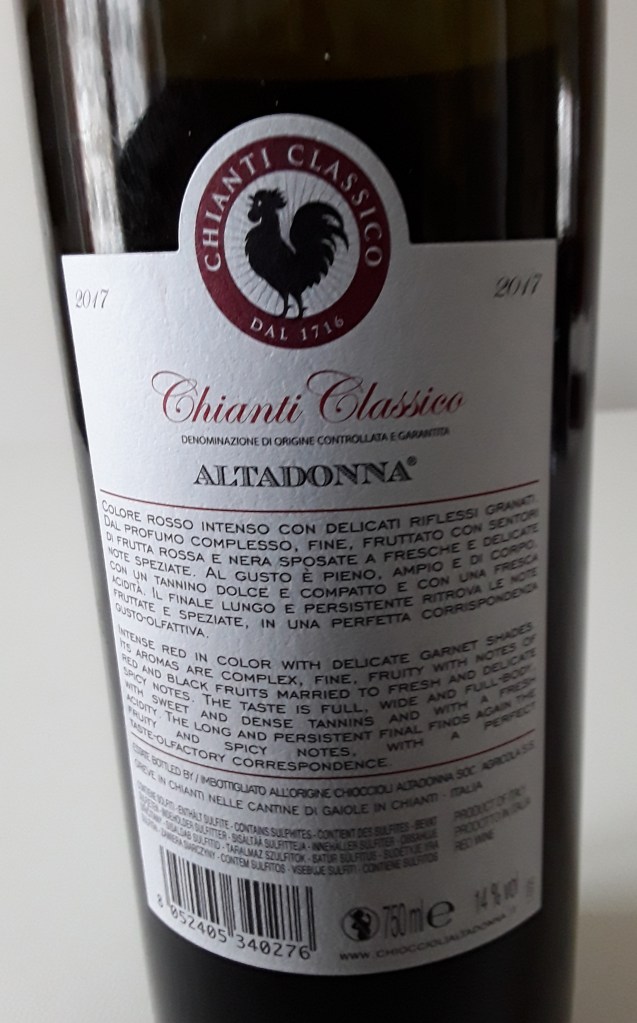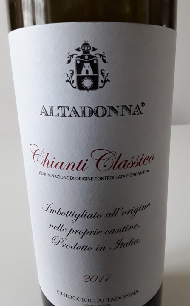 Chianti Classico Docg 2017 Az. Altadonna. Ottenuto da Sangiovese 90% e Merlot 10% , dopo aver svolto la malo,si eleva in barriques di rovere francese “sur lies” per 12 mesi. Dopo l’ imbottigliamento, affina per 6 mesi in vetro prima di essere immesso sul mercato. A livello sensoriale: si presenta nel calice con una veste rosso rubino intenso con delicate sfumature granato. Portandolo al naso si percepiscono eleganti sentori di rosa, violacciocca, ciliegia, mora e prugna che immancabilmente vanno a seguire nuances speziate e tostate. Al palato è di una piacevole beva, caratterizzato da tannini poderosi ma al contempo setosi, in perfetto equilibrio con freschezza e tenore alcolico, fine e munito di una lunga persistenza. Un vino davvero ben fatto.