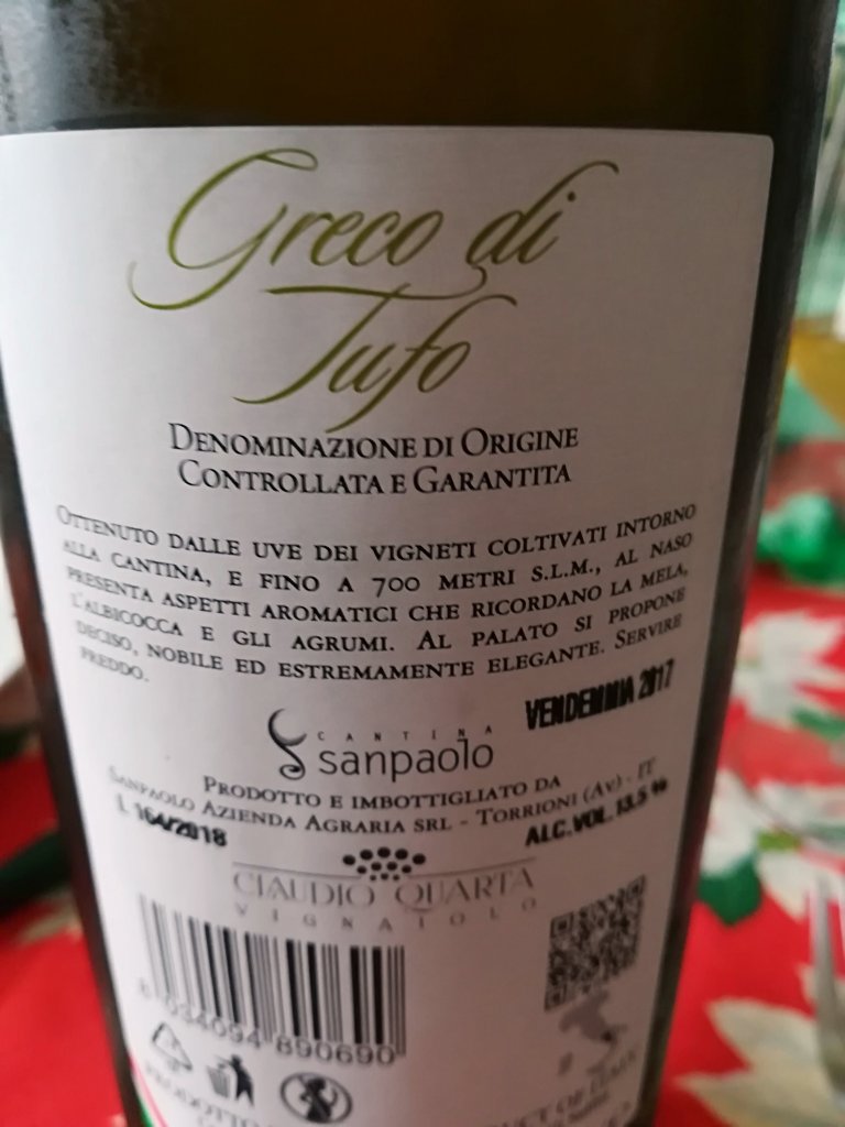 Greco di Tufo Docg 2017 Az. Cantina Sanpaolo Claudio Quarta, ottenuto con l’omonimo vitigno ( considerato tra i più importanti della Campania), vinificato interamente in acciaio, a livello sensoriale: si presenta nel calice con una bellissima tonalità giallo paglierino con riflessi che virano sul dorato, al naso sprigiona eleganti sentori di pera, albicocca, scorza d’arancia, forsizia, camomilla e confetto, al palato è piacevolmente sapido e succoso, spinto da una buona vena fresca. Armonico e dotato di una buona persistenza aromatica.
