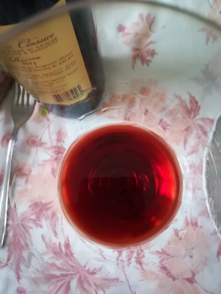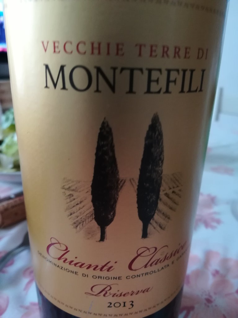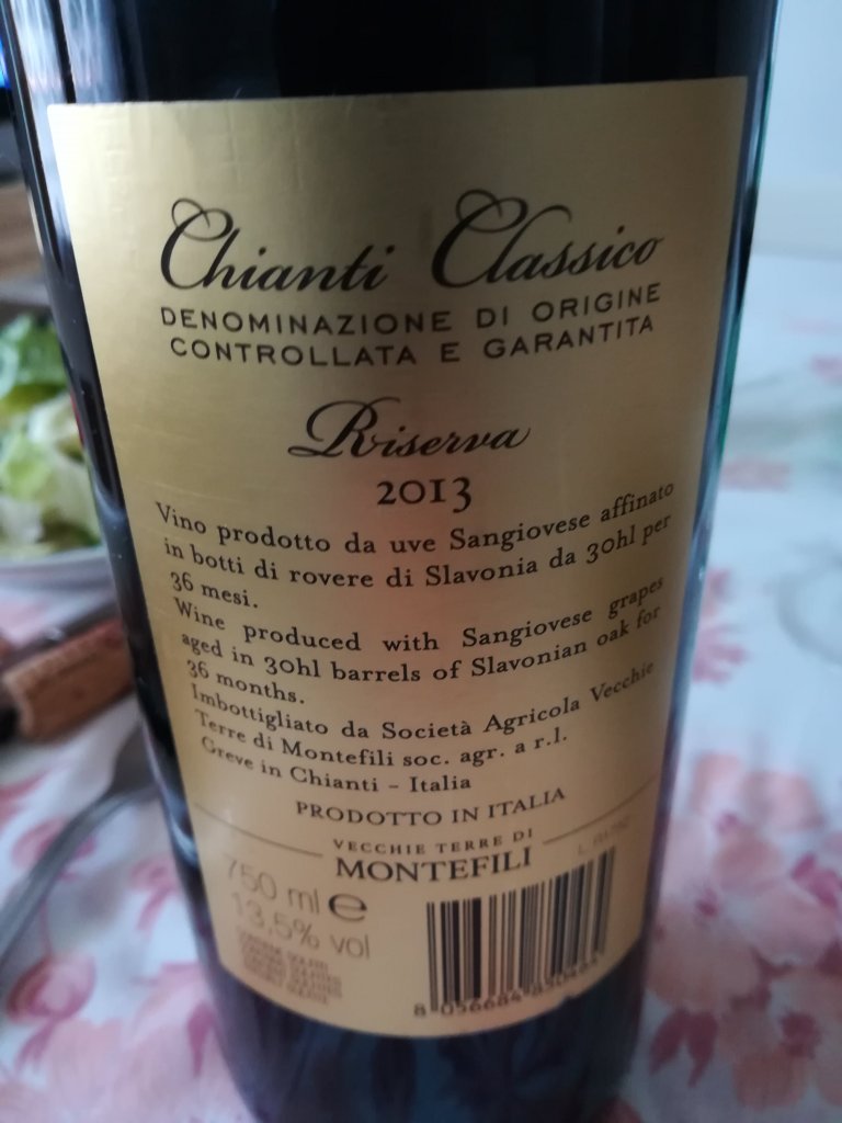 Chianti Classico Riserva 2013 Az. Vecchie Terre di Montefili, ottenuto interamente da uve di Sangiovese, la sua maturazione prima dell’ imbottigliamento è di un periodo di 36 mesi in botti di rovere di Slavonia di 30 hl. A livello sensoriale: si presenta nel calice con un invitante colore rosso rubino intenso con sfumature che virano sul granato, al naso sprigiona eleganti sentori di frutti di bosco, amarena, iris, viola appassita, rosa, tabacco, sottobosco, cannella e cuoio, al palato ti colpisce per il suo grande equilibrio ed armonia, un vino di buona struttura con un finale senza ombra di dubbio lungo e persistente. Mamma mia che buon vino.