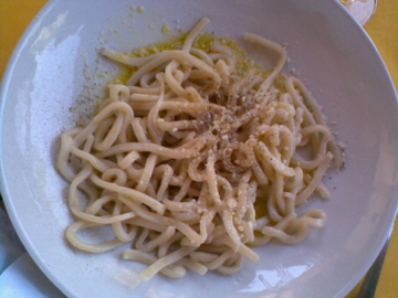 Pici, sono una pasta tipica della zona, simili a spaghetti ma più larghi, ottenuti da un impasto di acqua e farina, anche se alcuni aggiungono una piccola quantità di uova e lavorati a mano. Con questo tipo di pasta, si possono preparare Pici all’Aglione, Pici cacio(pecorino) e pepe, Pici alle briciole, Pici con svariate tipologie di ragù, come ragù di Chianina.