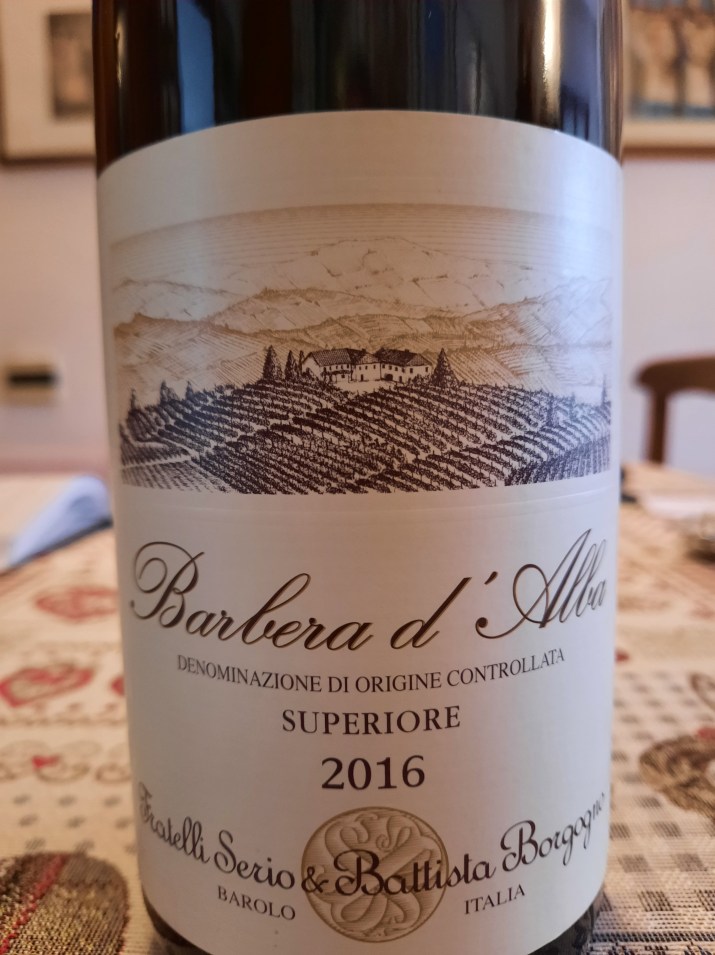 Barbera d’Alba Doc Superiore 2016 Az. Fratelli Serio & Battista Borgogno, ottenuto con uve dell’ omonimo vitigno, provenienti da vigneti posti a 250 metri sul livello del mare, siti in Castellinaldo, Diano d’Alba e Borgata vicino a Vergne, da suoli di marne sabbiose e argillose. Affina in botti di rovere di Slavonia da 25-50 hl di Garbellotto, una delle aziende leader europee della produzione di botti, con sede a Conegliano Veneto, la durata dell’invecchiamento in legno è soggetta a variazioni a seconda delle singole annate. Affina in bottiglia per un periodo di circa sei mesi, prima di essere immesso sul mercato. A livello sensoriale: si presenta nel calice con un bellissimo colore rosso rubino con riflessi purpurei, al naso i sentori dominanti sono di marasca, ma arrivano anche accenni floreali di rosa, di viola e poi boisè e anche liquirizia, cacao e pepe nero, al palato è coerente con ciò che hai percepito al naso, i tannini sono poderosi ma setosi, buona la vena fresca, un vino davvero equilibrato, munito di una piacevole morbidezza e una lunghissima persistenza aromatica. Averne