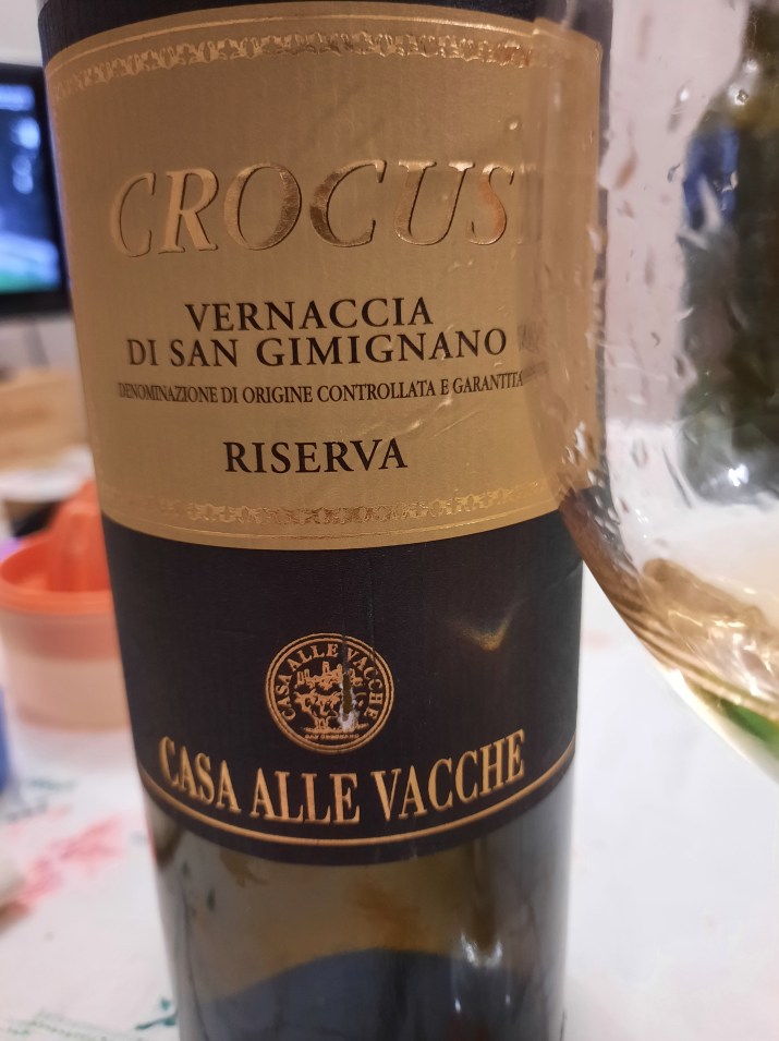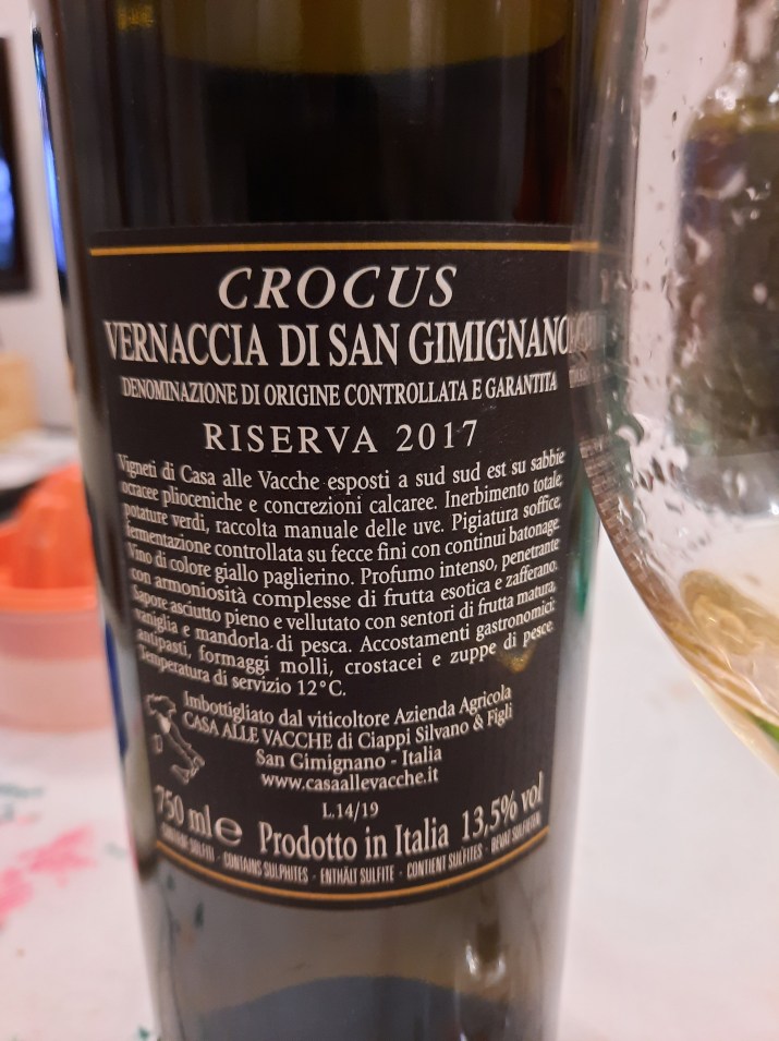 Crocus Vernaccia di San Gimignano Docg Riserva 2017 Az. Casa alle Vacche, ottenuto prevalentemente con uve di Vernaccia di San Gimignano ed un piccolo saldo di Chardonnay. A livello sensoriale : si presenta nel calice con un’ ammaliante tonalità giallo dorato, accompagnato da una bella brillantezza, all’ olfatto ha una buona complessità e sprigiona evidenti ed eleganti sentori di pesca, vaniglia, ananas, mango, cardamomo, zafferano, frutta sciroppata e confetto di mandorle, al palato si contraddistingue per una buona morbidezza, con finale fresco e giustamente sapido. La prima volta che ho degustato l’ annata 2017 è stata oltre un anno fa a Wine & Siena, oggi ho riscontrato a distanza di un anno la sua evoluzione. Un vino pieno ed appagante. Un grande vino bianco italiano che ha una notevole capacità d’ invecchiamento, un motivo plausibile per produrre anche la tipologia ” Riserva “. Spero di aver modo di tornare a San Gimignano per l’occasione dell’ Anteprima della Vernaccia di San Gimignano che avrà luogo a metà maggio p.v.e di poter degustare la nuova annata di questo vino.