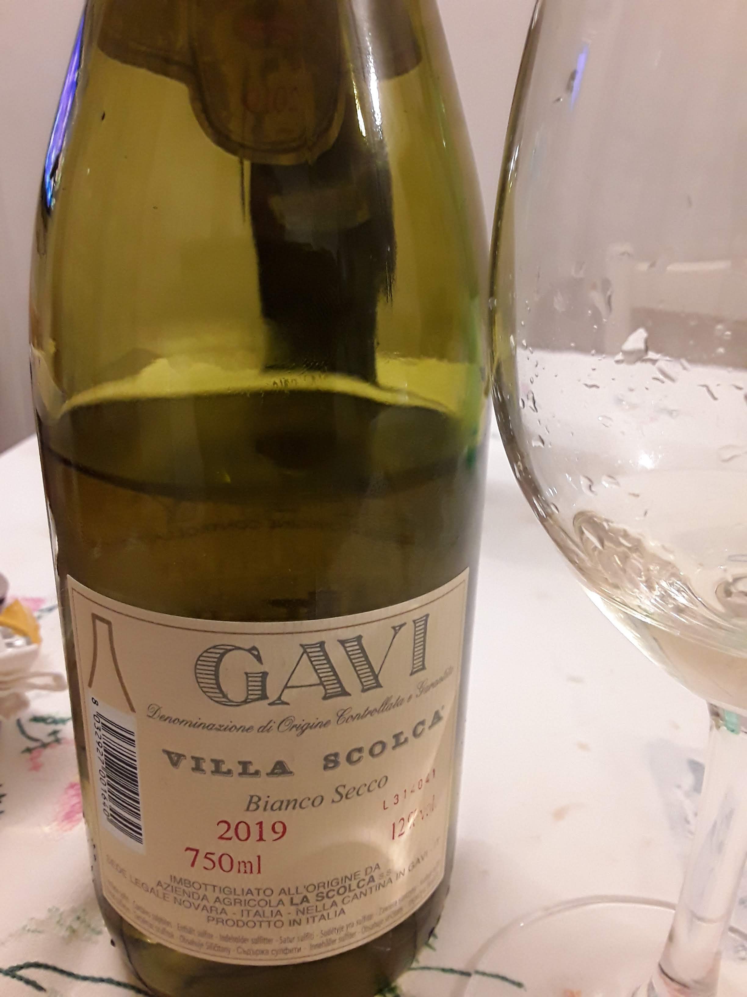 Gavi Villa Scolca Docg 2019 Az. La Scolca, ottenuto con uve di Cortese, vinificato sur lie, a livello sensoriale: si presenta nel calice con una bellissima tonalità giallo paglierino con riflessi che virano sul verdolino, al naso sprigiona eleganti sentori di pesca, susina, mela, fiori di campo e forsizia che ben si fondono con note agrumate di lime, al palato è piacevolmente fresco e rinfrescante, dotato di una buona vena sapida, che assicura lunghezza e chiude con una scia leggermente amarognola, Un vino molto piacevole.