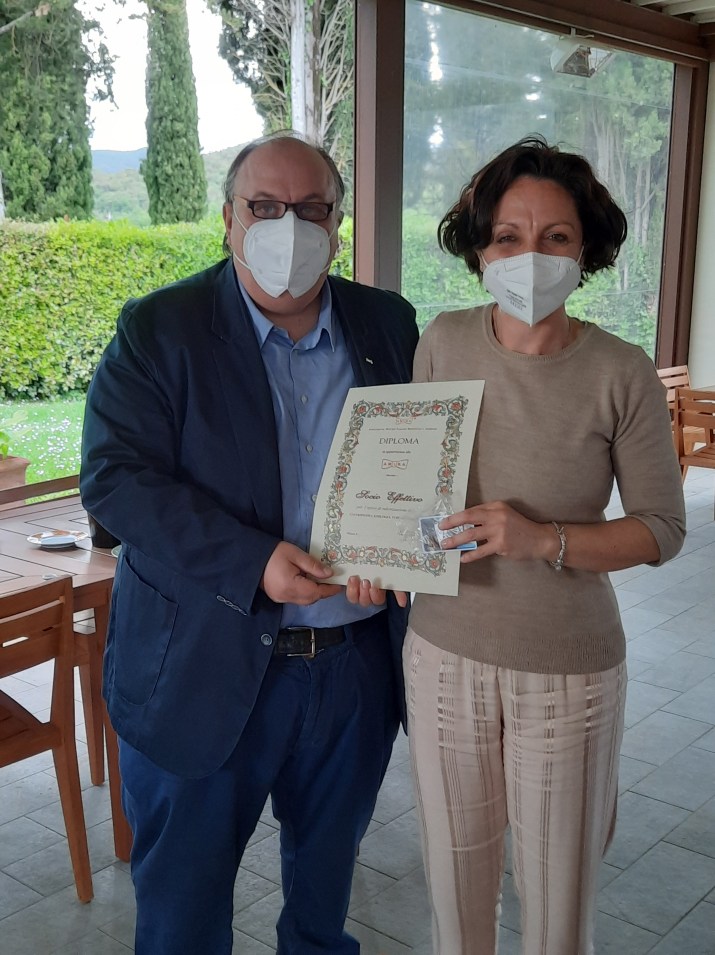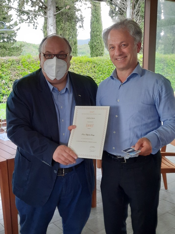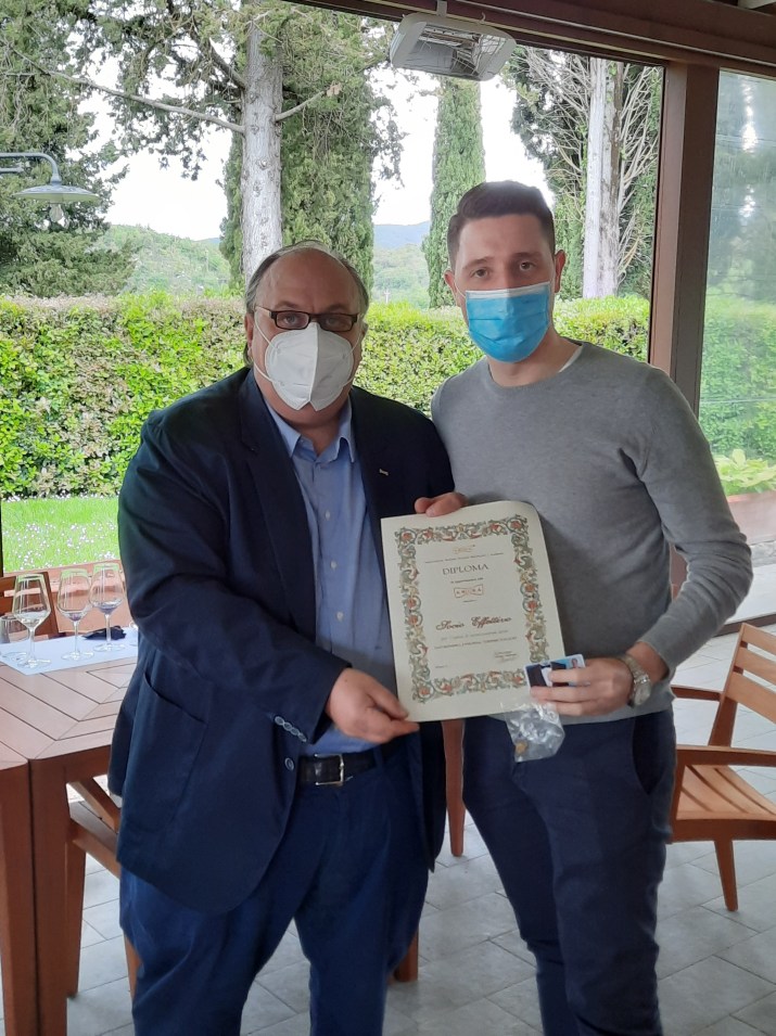 La mia prima visita in azienda vitivinicola a San Felice porta la data del lontano 1989. Da allora più volte ho avuto il piacere di tornare in questa bellissima azienda. La Tenuta è immersa tra bellississimi boschi , vigneti e uliveti, in un paesaggio di indicibile bellezza, digradante verso il Monte Amiata per quanto riguarda la parte sud e verso Siena. Oggi con amici e colleghi, tutti soci dell’Amira (Associazione Maitres Italiani Ristoranti Alberghi) sono tornato di nuovo a San Felice. A riceverci Francesco Baroni e Gabriella Cosenza del team di Borgo San Felice. Il nostro tour inizia dal vigneto adiacente alla Cantina, per poi proseguire in zona vinificazione e poi maturazione dei vini, ove trovano dimora rotondeggianti botti di varie dimensioni. È seguita la degustazione dei vini di varie annate nella veranda del ristorante il Grigio, al momento chiuso, in tutta sicurezza per quanto riguarda le norme anti covid. È stata anche l’occasione da parte del Fiduciario della Sezione Chianciano Terme-Siena, Gaetano Di Martino in presenza del Tesoriere Nazionale Cesare Lo Verde, di consegnare gli attestati ai nuovi soci, Gabriella Cosenza, Calogero Milazzo ed Alessandro Barabassi. Francesco e Gabriella ci hanno guidato nel tour, con questo post vorremmo ringraziarli sia per il tempo a noi dedicato che per l’ospitalità ricevuta. Abbiamo trascorso un bel pomeriggio, l’ unico problema è stato tornare via. Seguono cenni sull’ azienda.