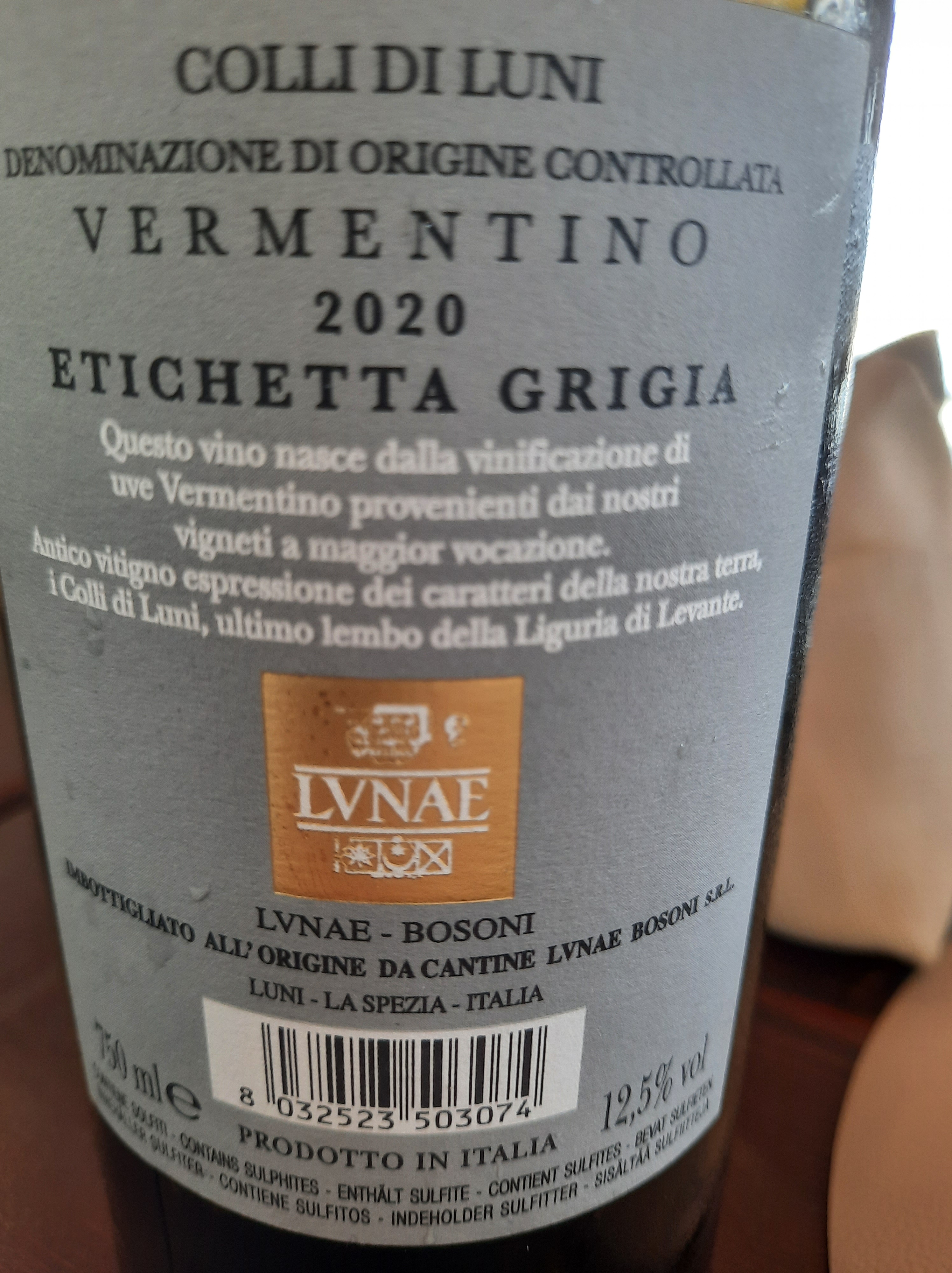 Vermentino Colli di Luni Etichetta Grigia Doc Az. Lunae 2020, si presenta nel calice con una bellissima tonalità giallo paglierino con evidenti riflessi verdolini, al naso sprigiona eleganti sentori di pompelmo, biancospino, fiori di acacia, mela, pesca e melone , al palato è piacevolmente fresco, sapido e duraturo. Compagno ideale di una buona frittura di pesce.