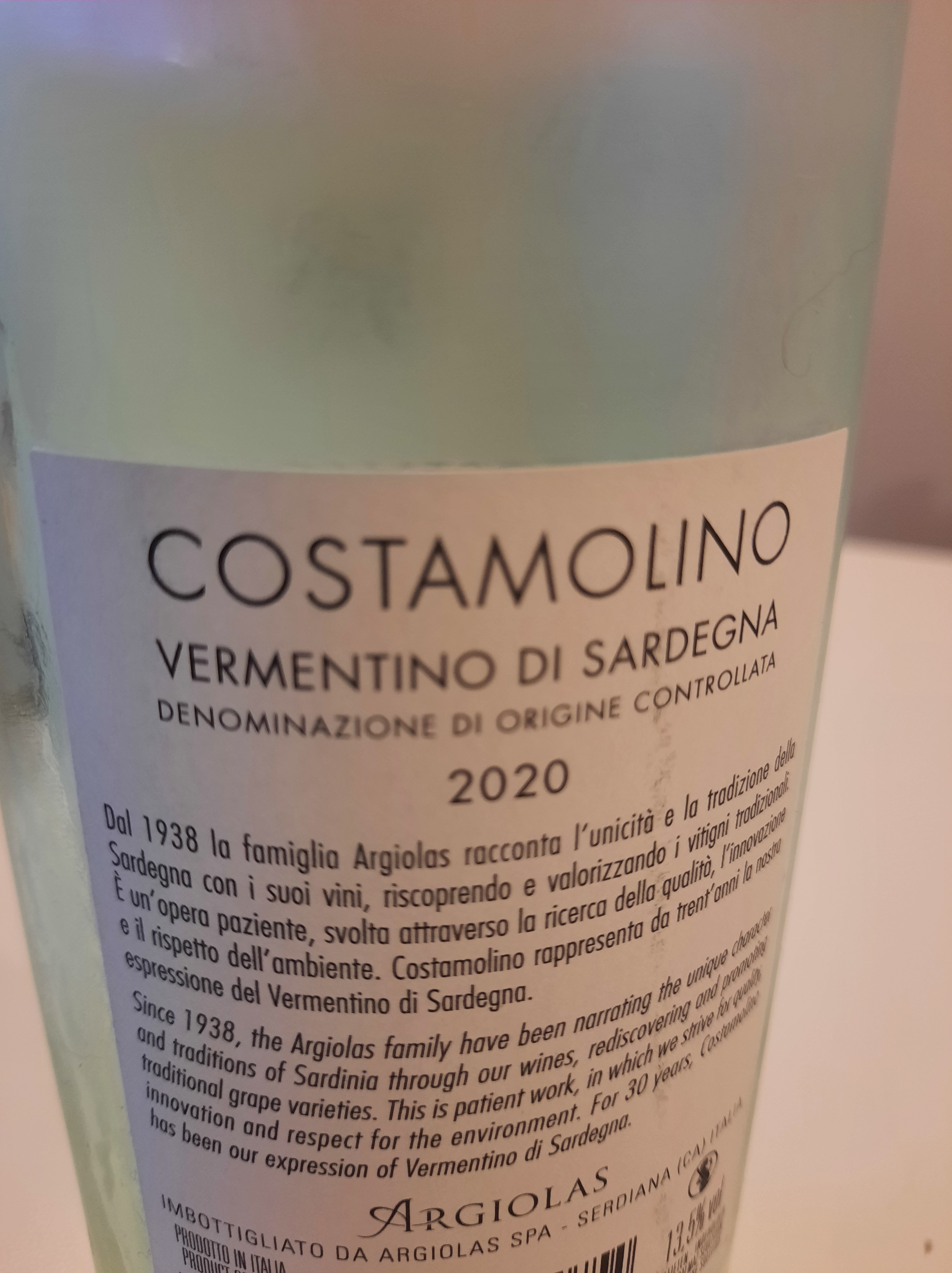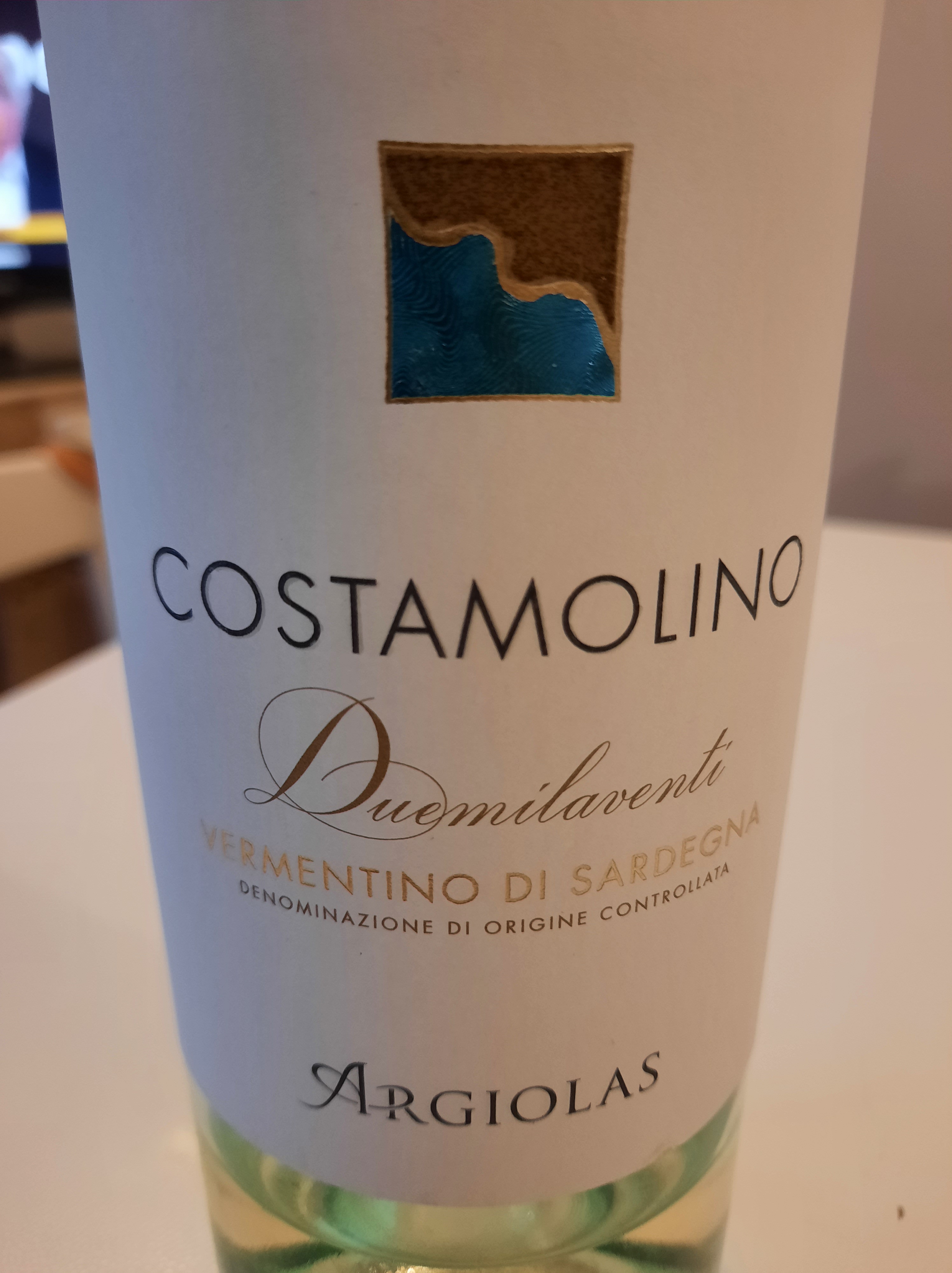 Vermentino di Sardegna Costamolino Doc 2020 Az. Argiolas, ottenuto interamente con uve di Vermentino, a livello sensoriale: si presenta nel calice con un invitante colore giallo paglierino con riflessi leggermente verdolini. Al naso sprigiona note sottili, fini e delicate di agrumi, fiori bianchi, pesca, susina, nespola, ananas e melissa. Al palato è piacevolmente fresco e secco, caratterizzato da una piacevole sapidità, una buona corrispondenza gusto-olfattiva e una buona persistenza aromatica. Ottimo il rapporto qualità/prezzo.