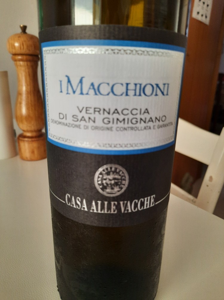 Vernaccia di San Gimignano “I Macchioni” 2020 Az. Casa alle Vacche. Ottenuto con uve di Vernaccia di San Gimignano in purezza, la fermentazione avviene a temperatura controllata su fecce fini e affina in bottiglia per almeno 1 mese. A livello sensoriale: si presenta nel calice con una bellissima tonalità giallo paglierino con evidenti riflessi verdolini, al naso una buona finezza rimanda sentori di susina, pesca, lime e mandorla, al palato una piacevole freschezza e una buona sapidità, unite ad un finale persistente ne fanno un vino di apprezzabile bevibilita’.