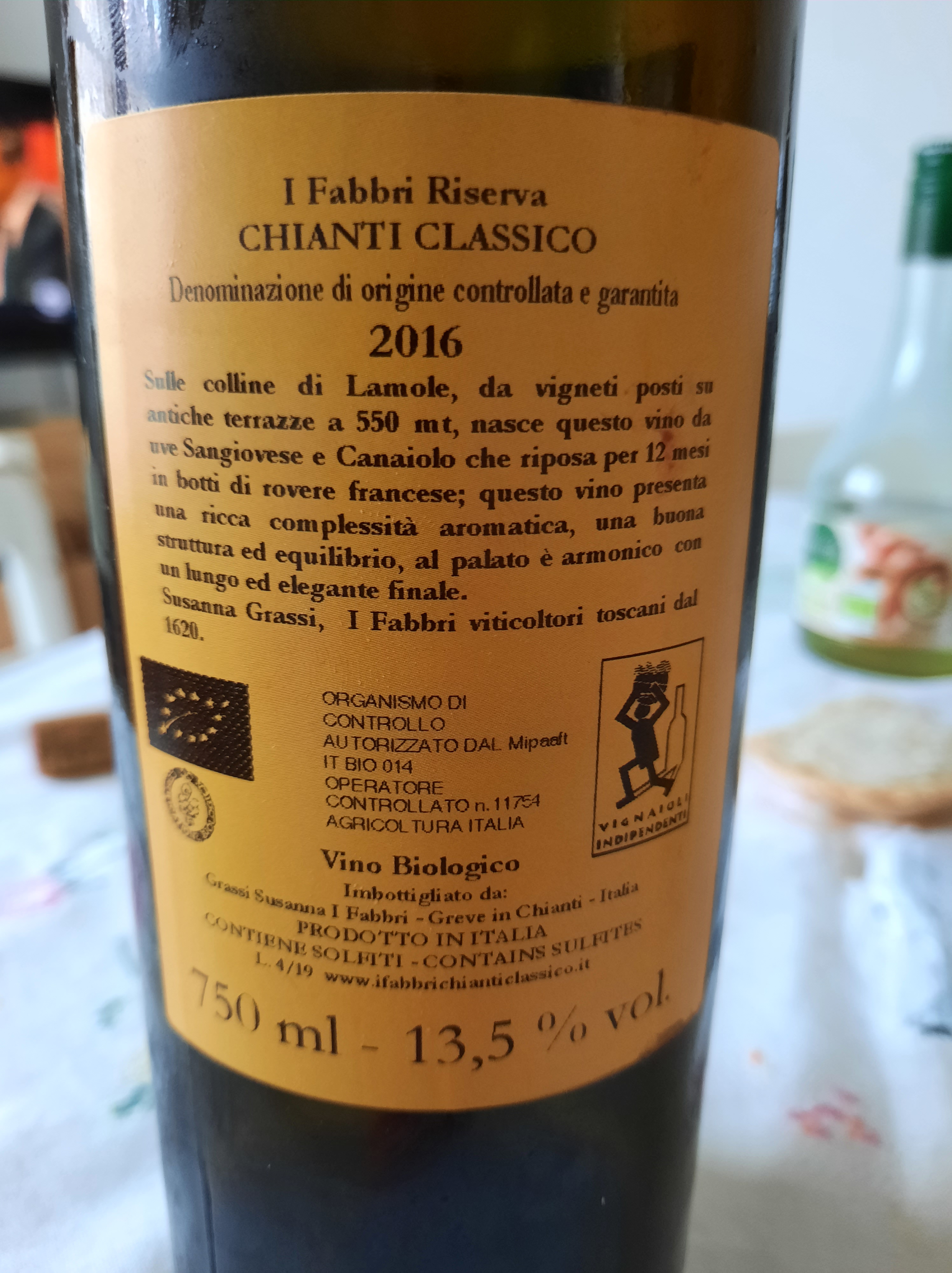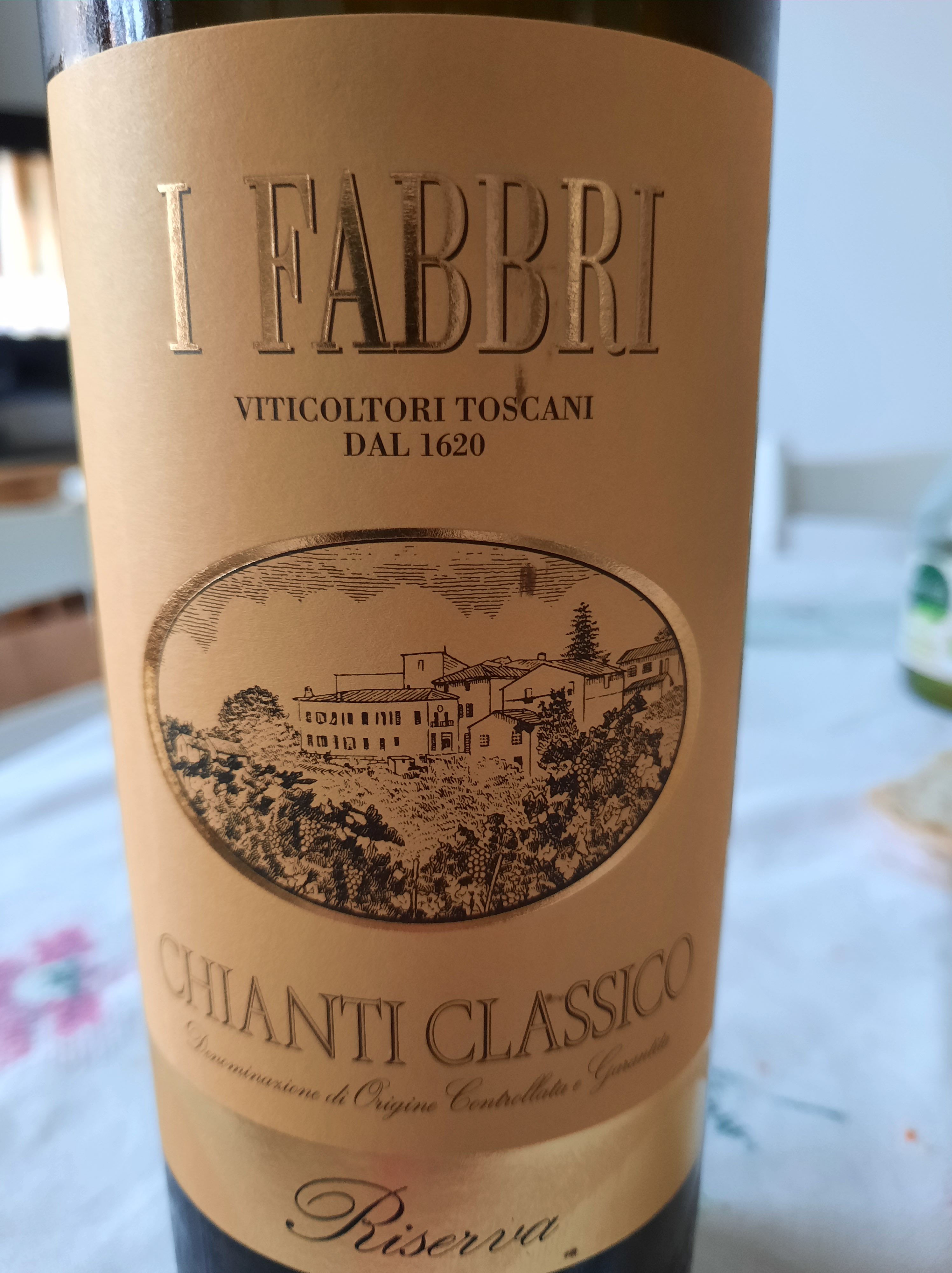 Chianti Classico Riserva 2016 Az. I Fabbri, ottenuto interamente da uve di Sangiovese provenienti da vecchi vigneti, a livello sensoriale: si presenta nel calice con un bellissimo colore rosso rubino intenso, al naso sprigiona eleganti sentori di violacciocca, ciliegia, frutti di bosco, sottobosco, vaniglia, rovere e note leggermente speziate di pepe nero e bacche di ginepro. Al gusto è molto piacevole, munito di una buona trama tannica e vena fresca, un vino lungo e duraturo. Ma che buon vino ragazzi