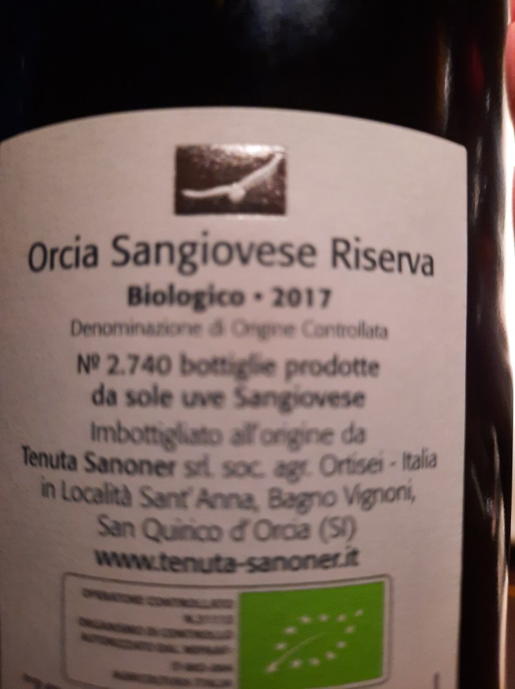 Aetos Orcia Sangiovese Doc Riserva 2017 Az. Tenuta Sanoner, ottenuto interamente con uve dell’ omonimo vitigno, fermenta spontaneamente grazie alla sola azione dei lievi indigeni in tini speciali di cemento, la fermentazione malolattica avviene in tini di acciaio, il vino è affinato per almeno 12 mesi in barriques, tonneaux e piccole botti da 10/15 hl di rovere, provenienti da Francia e Austria. A livello sensoriale: si presenta nel calice con un bellissimo colore rosso rubino, trasparente e consistente, al naso sprigiona eleganti sentori di violacciocca, rosa, ciliegia, fragola e lampone, impreziosite da note speziate e balsamiche, al palato è piacevole e ben equilibrato, ove freschezza e morbidezza con tannini copiosi, ma setosi ne fanno un vino fine, la sua persistenza aromatica è decisamente lunga. Un gran bel Sangiovese. Storicamente la zona geografica è sempre stata considerata un’area vocata per la coltivazione della vite e per la produzione del vino, alcuni toponimi, come “vignoni” e “Bagno vignoni” ne sono una testimonianza.