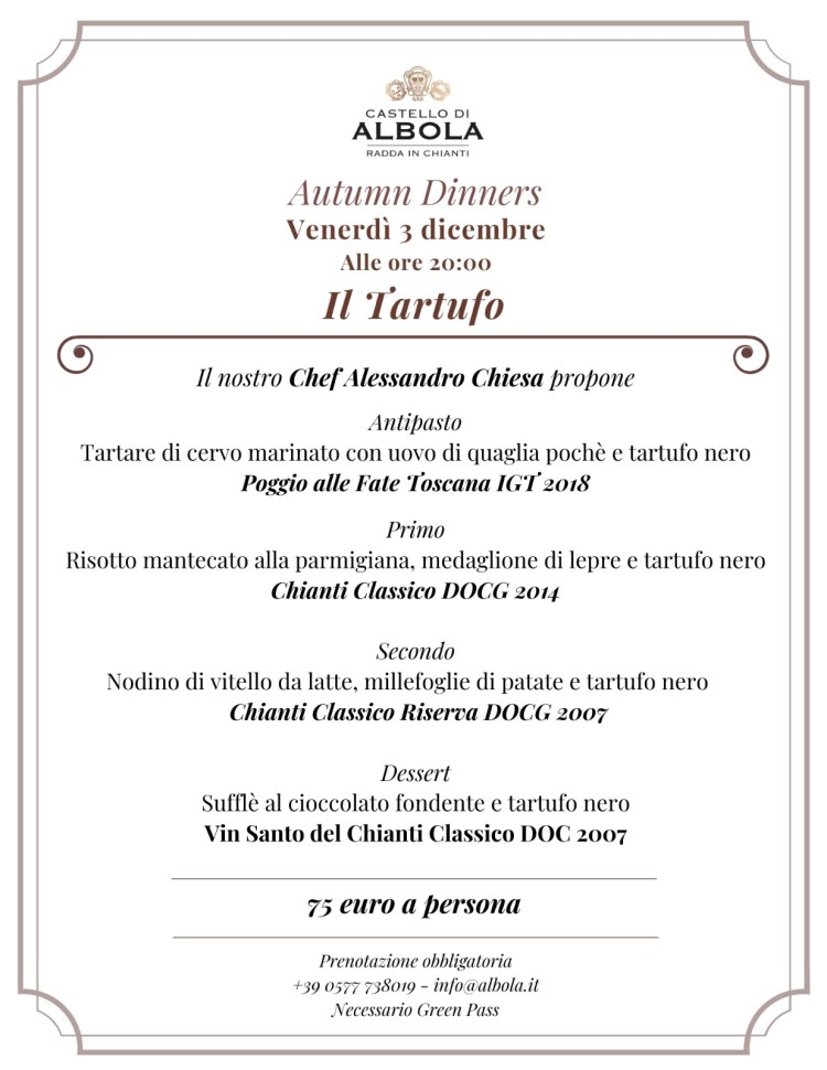 Il Castello di Albola, il 3 dicembre p.v. organizza una cena ove il tartufo è il protagonista di ogni piatto, in abbinamento i vini della Tenuta con importanti annate. Un luogo posto nelle meravigliose colline chiantigiane e nel Comune di Radda in Chianti. Un Castello medievale appartenuto ad importanti famiglie, dal 1979 è di proprietà della famiglia Zonin. Per prenotazioni, potete chiamare il numero telefonico: 0577 738019 o inviare una mail a: info@albola.it, a seguito il menù: