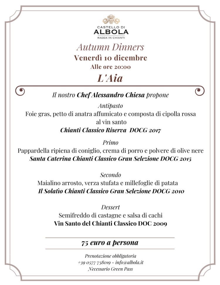 Il Castello di Albola, il 10 dicembre p.v. organizza una cena, il cui tema è “L’Aia”, preparata dall’esperto Chef Alessandro Chiesa, con abbinamento vini della Tenuta di importanti annate. Un luogo meraviglioso posto nelle suggestive colline chiantigiane nel Comune di Radda in Chianti, a poca distanza dal centro abitato. Un Castello medievale appartenuto ad importanti famiglie, alcune su tutte gli Acciaioli, i Samminiati, i Pazzi, i Ginori Conti; dal 1979 è di proprietà di un’ importante famiglia di produttori di vino: “Famiglia Zonin”. La Tenuta si estende su una superficie di 900 ettari, di cui 125 sono vitati. Al timone dell’ azienda c’è il bravissimo e dinamico Enologo Alessandro Gallo. Ho partecipato ad una cena lo scorso 3 dicembre e devo dire di avere avuto un’ esperienza enogastronomica emozionante, piatti squisiti e ben preparati, vini di elevata qualità, servizio impeccabile con accogliente e cordiale ospitalità che sa metterti a proprio agio. Non ho nessuna esitazione a consigliare una simile esperienza a chi come me ama il buon cibo, il buon vino, luoghi unici come il Castello di Albola e persone gentili. Per prenotazioni, potete chiamare il numero telefonico: 0577 738019 o inviare una mail a: info@albola.it, a seguito il menù della serata: