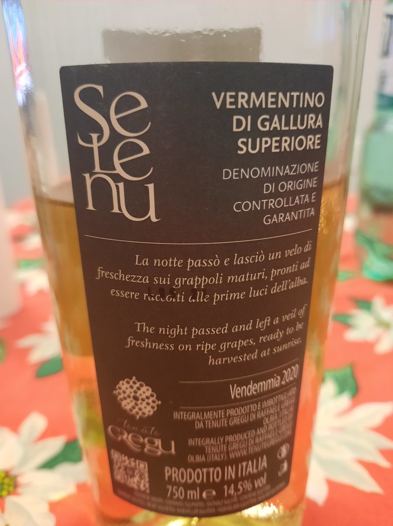 Selenu Vermentino di Gallura Docg Superiore 2020 Tenute Gregu, ottenuto interamente con uve dell’ omonimo vitigno, dopo la vinificazione, il vino viene mantenuto a contatto con i lieviti per un periodo di 4 mesi, a livello sensoriale: si presenta nel calice con una bellissima tonalità giallo dorato, al naso sprigiona eleganti sentori di pesca, melone, mango, salvia e note iodate che vanno a seguire una piacevole scia agrumata di mandarino, al palato è piacevolmente fresco ed avvolgente e prende impulso per una incredibile e lunga persistenza aromatica. Un gran bel Vermentino.