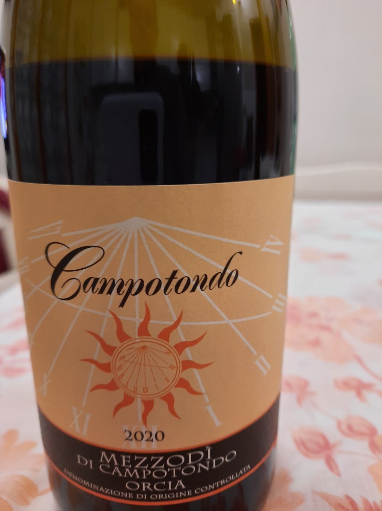 Mezzodì di Campotondo Orcia Doc 2020, ottenuto interamente con uve di Sangiovese, matura per un periodo minimo di 8 mesi in acciaio sulle proprie fecce fini e affina in bottiglia per almeno 3 mesi; a livello sensoriale: si presenta nel calice con una bellissima tonalità rosso rubino che più rubino non si può, trasparente e consistente, al naso sprigiona eleganti sentori di violetta, rosa, prugna, frutti di bosco, impreziositi da note di tabacco, al palato è piacevolmente fresco e morbido, la trama tannica ben si integra con alcool e prende impulso per una lunga persistenza aromatica. Un vino che fa parte della categoria “bere bene senza svenarsi”. L’ ho abbinato con tagliata di manzo con olio aromatizzato alle erbe aromatiche su letto di radicchio variegato, devo dire che lo accompagnava proprio bene.