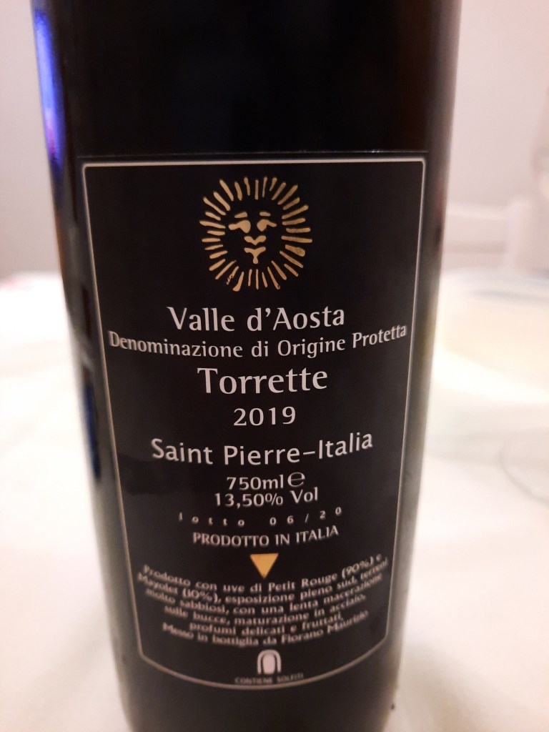 Torrette Valle d’Aosta Dop 2019 CHÂTEAU FEUILLET, ottenuto con uve di Petit Rouge-90% e Mayolet-10% provenienti da Saint Pierre, dopo la vendemmia viene fatta una lenta fermentazione e a seguire la malolattica. Il vino viene messo a maturare in vasche di acciaio e una piccola parte in legno. In primavera viene effettuato l’assemblaggio delle masse e a seguire viene effettuato l’imbottigliamento. A livello sensoriale: si presenta nel calice con un bellissimo colore rosso rubino intenso, al naso rimanda eleganti sentori di mora, prugna, ciliegia e tabacco, impreziositi da note speziate, al palato è avvolgente, fresco e sapido, dotato di tannini nobili e una formidabile gradevolezza di beva. il sorso, dura in bocca piuttosto a lungo. Lo vedo molto bene con piatti valdostani, come: civet, formaggi stagionati e boudin.