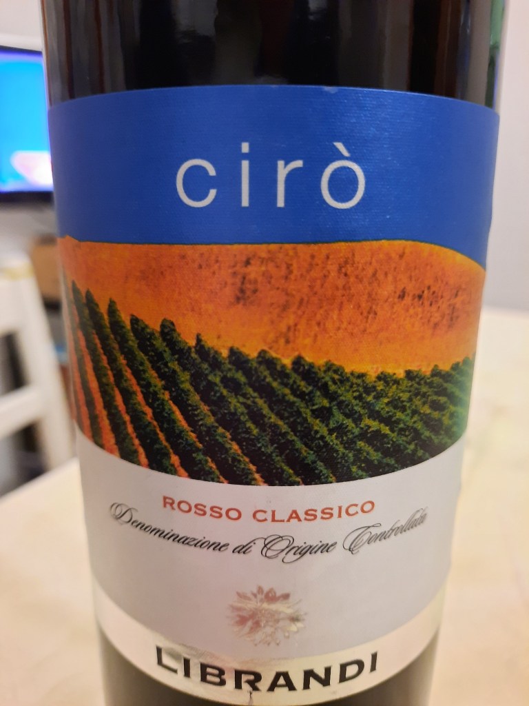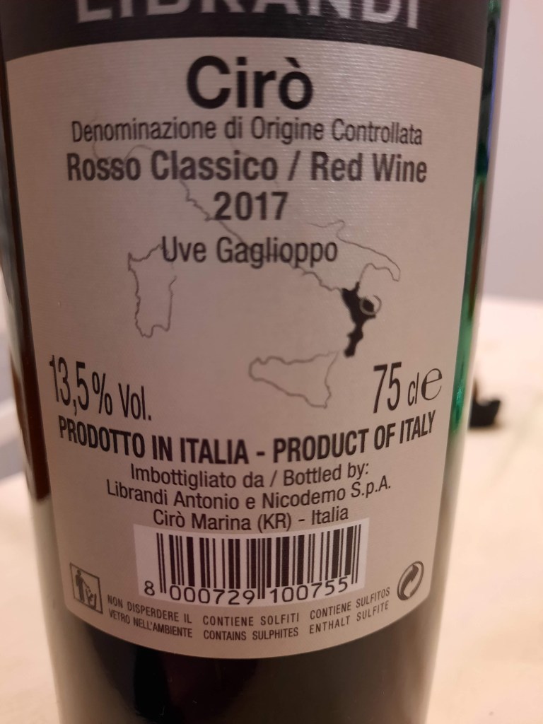 Cirò Rosso Classico Doc 2017 Az. Librandi , ottenuto interamente con uve di Gaglioppo, si presenta nel calice con un bellissimo colore rosso granato chiaro e trasparente; al naso sprigiona eleganti sentori di frutti di bosco, mirtilli in primis, rosa, erbe, prugne e nuances di spezie dolci, foglie di tabacco e sottobosco; al palato è avvolgente con tannini setosi, un vino equilibrato e di buona struttura, ciò che hai percepito nella fase olfattiva, lo ritrovi puntualmente al gusto. Lo vedo bene in abbinamento con salsiccia, arista di maiale, lasagne al forno e salumi. Un vino che ha un rapporto qualità/prezzo, molto, ma molto notevole.