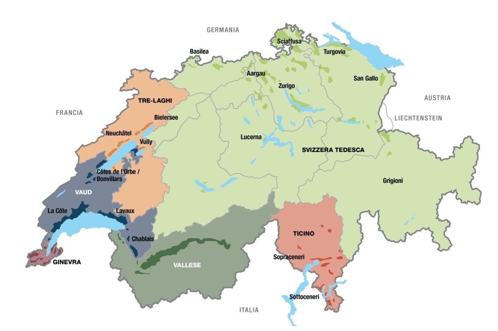 La Svizzera è un gran bel Paese, caratterizzato da montagne, laghi, fiumi e dolci colline, con una piccola ma importante produzione vitivinicola, la viticoltura svizzera affonda le origini sin dai tempi dei romani ed è suddivisa in sei zone principali: Vallese, Vaud, Ticino, Svizzera tedesca, Neuchâtel e la regione dei Tre Laghi, oltre alla zona del lago di Ginevra. I vitigni coltivati sono metà a bacca bianca e metà a bacca nera. Nella Svizzera Romanda viene maggiormente coltivato lo Chasselas ed il Gamay, in Svizzera tedesca il Riesling ed il Sylvaner, in Svizzera orientale è il Pinot Nero che la fa da padrone ed alcuni autoctoni, il vitigno principale della Svizzera meridionale è il Merlot insieme a Pinot Gris, Pinot Blanc, Chardonnay, Gewürztraminer ed altri, nel Vallese vengono coltivati alcuni vitigni autoctoni. Nei vigneti di questa splendida nazione affondano le radici di ben 252 vitigni diversi. L’esportazione del vino svizzero è molto bassa, viene maggiormente consumato in loco, per cui se si vuole degustare i vini ivi prodotti è consigliabile recarsi in Svizzera. Una piccola curiosità: il vigneto più piccolo del mondo, è composto solo da tre viti. Si trova nel Vallese, misura 1,6 metri quadrati e dal 1999 è di proprietà del Dalai Lama.