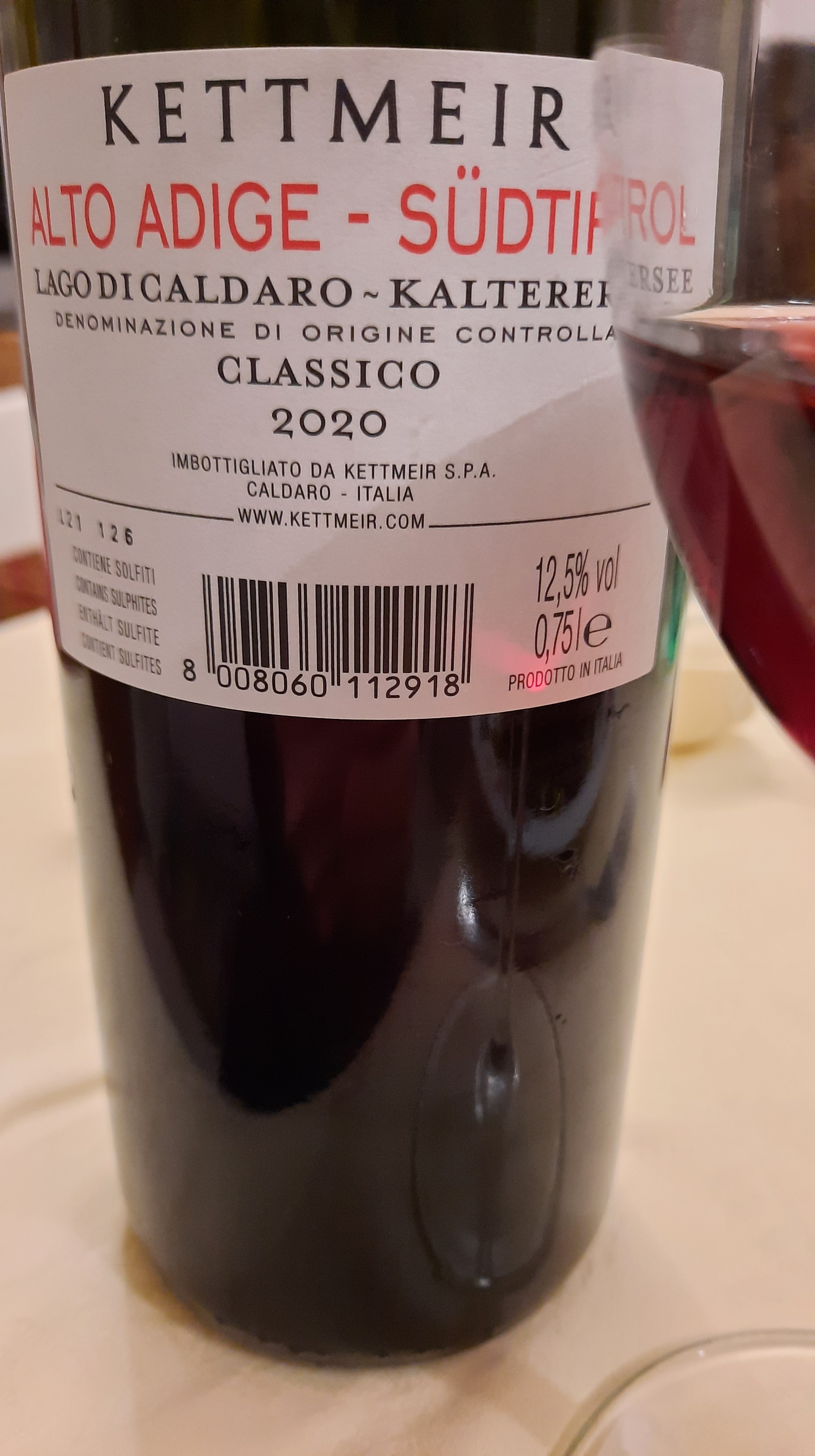 Lago di Caldaro – Kalterersee Alto Adige Doc 2020 Az.Kettmeier, ottenuto con 95% di uve Schiava e 5% Lagrein, si presenta nel calice con un bellissimo colore rosso rubino, molto trasparente, al naso sprigiona eleganti sentori di viola, ciclamino, frutti di bosco e ciliegia, al palato è piacevolmente fresco e morbido, con un bel finale di mandorla amara e ciliegia. Vino ideale da tutto pasto, si consiglia particolarmente con primi alle verdure, carni di coniglio e pollo e con il tradizionale speck.