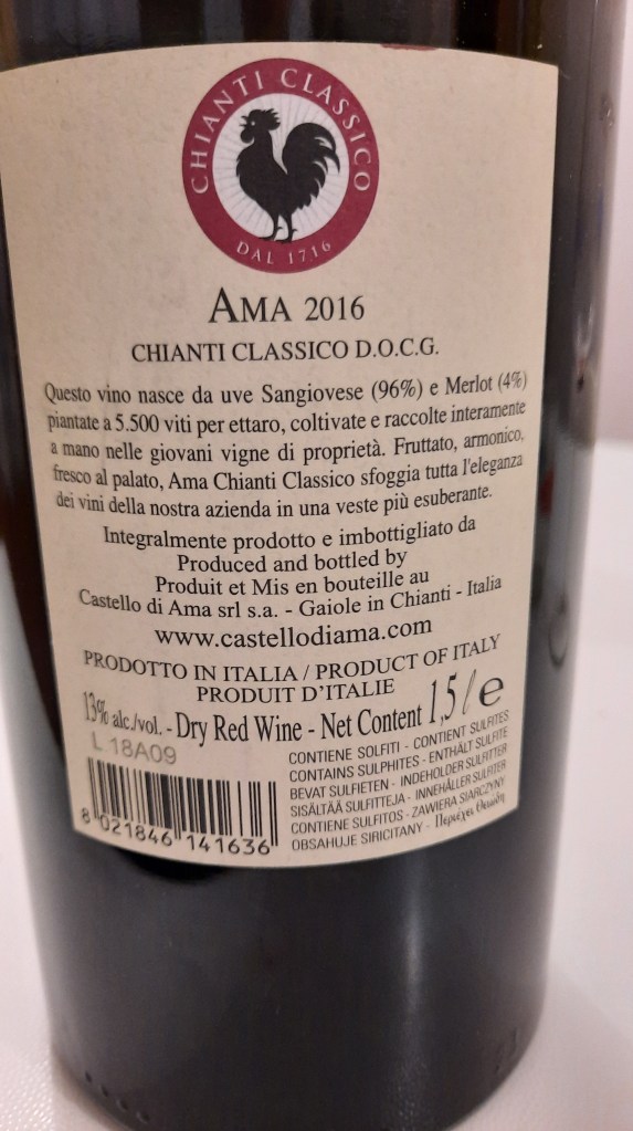 Chianti Classico Ama Docg 2016 Castello di Ama, ottenuto con uve di Sangiovese ed un saldo del 4% di Merlot, la fermentazione avviene ad opera dei soli lieviti indigeni e matura in barriques per un periodo minimo di 12 mesi. A livello sensoriale: si presenta nel calice con una bellissima tonalità rosso rubino con riflessi che virano sul granato; al naso dipana eleganti sentori di ciliegia, lampone, frutta rossa fresca e bacche di ginepro che vanno a seguire una scia speziata di pepe nero e chiodi di garofano; al palato è piacevolmente morbido, leggiadro, sapido e dotato di una lunga persistenza aromatica. Davvero un vino ben fatto, frutto di un’annata eccellente. A tavola, possiamo abbinarlo con primi piatti a base di carne e con la tipica bistecca alla fiorentina, inoltre con formaggi stagionati. La temperatura di servizio è di: 16/18°C.
