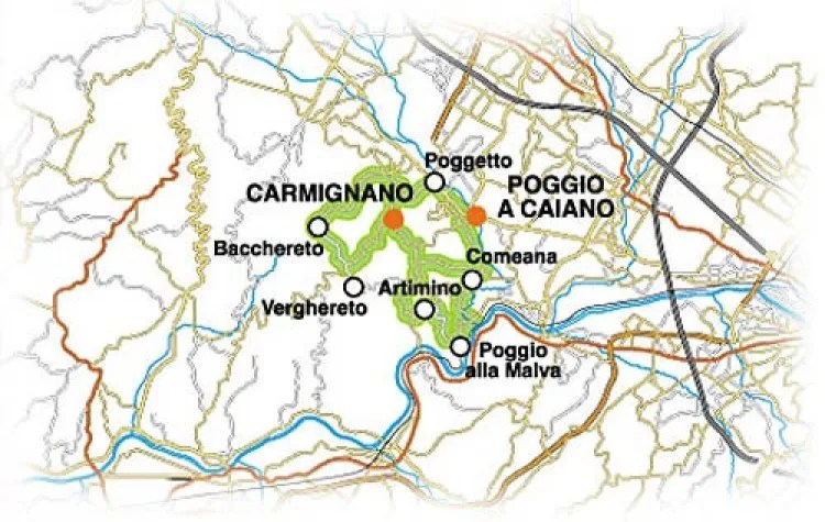 Il Carmignano Docg è una perla enologica della Toscana, l’areale si trova a metà strada tra Firenze e Pistoia con Prato di fronte ed in provincia di Prato. Lembo di terra ad alta vocazione sopratutto per la produzione di vini rossi, riconosciuta sia a livello nazionale che internazionale. La più piccola Docg italiana, a mio avviso qualitativamente è tra le più grandi. Sulla fascetta dei vini di Carmignano c’è una data: 1716. Indica la nascita del consorzio della congregazione che doveva vigilare sul rispetto delle regole per la produzione dei vini di Carmignano fissate già allora in un bando che porta la firma di Cosimo III dei Medici. Soli altri tre vini dell’epoca, in Toscana, erano riconosciuti e fissati i confini: Pomino, Chianti e Valdarno Superiore. Oltre ai vitigni Sangiovese, Canaiolo Nero, Malvasia e Trebbiano hanno trovato l’habitat ideale il Cabernet (uva Francesca) ed il Merlot. Il Carmignano nelle annate migliori viene prodotto anche in versione Riserva. Viene prodotto nel comune di Carmignano e a Poggio a Caiano, nel comune di Prato. I vigneti sono posti ad un altitudine che varia dai 250, sino ai 400 metri s.l.m. Su queste splendide e talvolta erte colline vengono prodotti anche altri vini: il Barco Reale di Carmignano , il Rosato di Carmignano, il Vin Santo di Carmignano ed il Vin Santo di Carmignano Occhio di pernice.