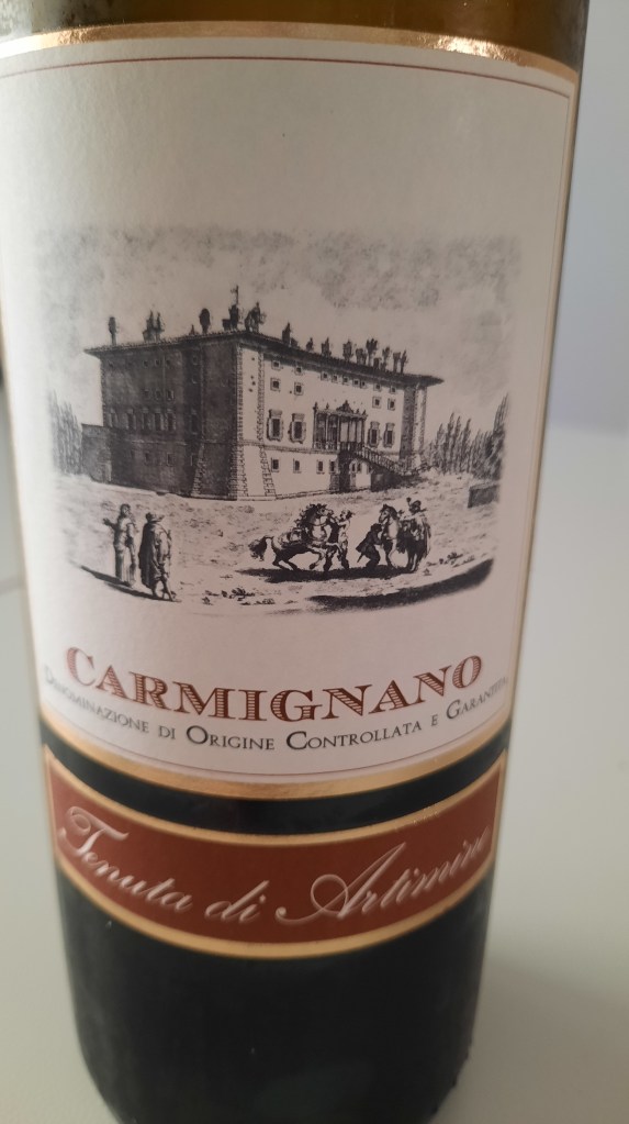 Tenuta di Artimino si estende su 732 ettari di proprietà, di cui 80 sono vitati. Immersa nel cuore della campagna Toscana, nell’ areale ove viene prodotto un grande vino italiano: il Carmignano. Tra i filari i vitigni coltivati sono il Sangiovese, il Cabernet Sauvignon, il Cabernet Franc, il Merlot, il Canaiolo, il Gamay per i rossi, mentre per la varietà a bacca Bianca il Trebbiano, lo Chardonnay, il Riesling Renano, il Souvignon Blanc, la Malvasia Bianca ed il San Colombano. Oltre alla Cantina vi è la famosa Villa medicea “La Ferdinanda”, i cui saloni sono ideali per eventi, divenuta nel 2013 patrimonio Unesco, lo stupendo hotel 4 stelle “Paggeria Medicea”, dotato di spazioso giardino, 2 piscine e campo da tennis. Di proprietà della famiglia Olmo, giunta oggi alla terza generazione. La cantina produce tutti i vini doc, docg e igt dell’ areale, la gamma è ampia . Ho visitato la cantina qualche anno fa con l’ amico e collega Antonio Caprara e spesso, quando partecipo a kermesse enoiche degusto volentieri i loro vini. Oggi mi sono trovato di fronte al vino sopra descritto.