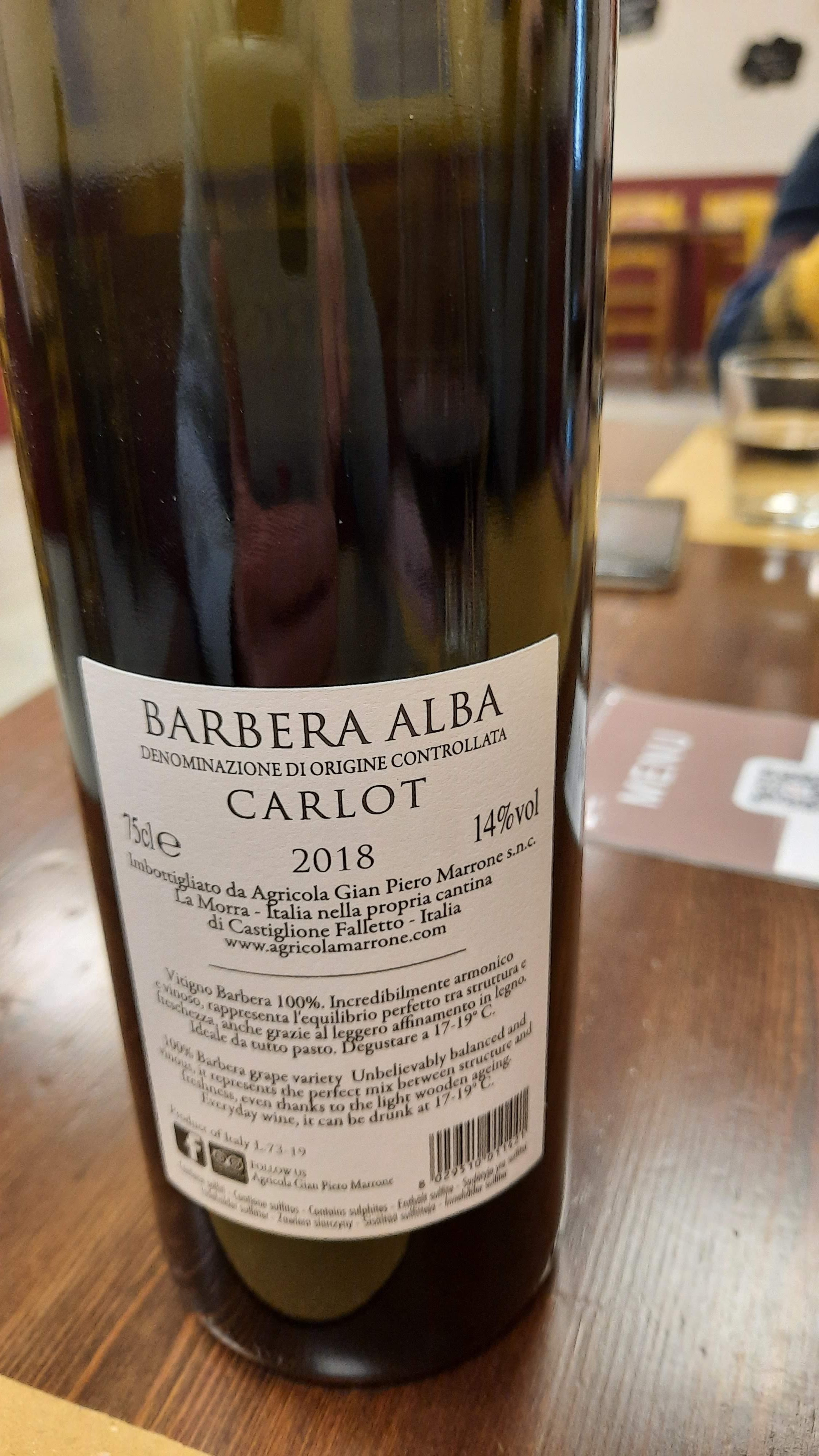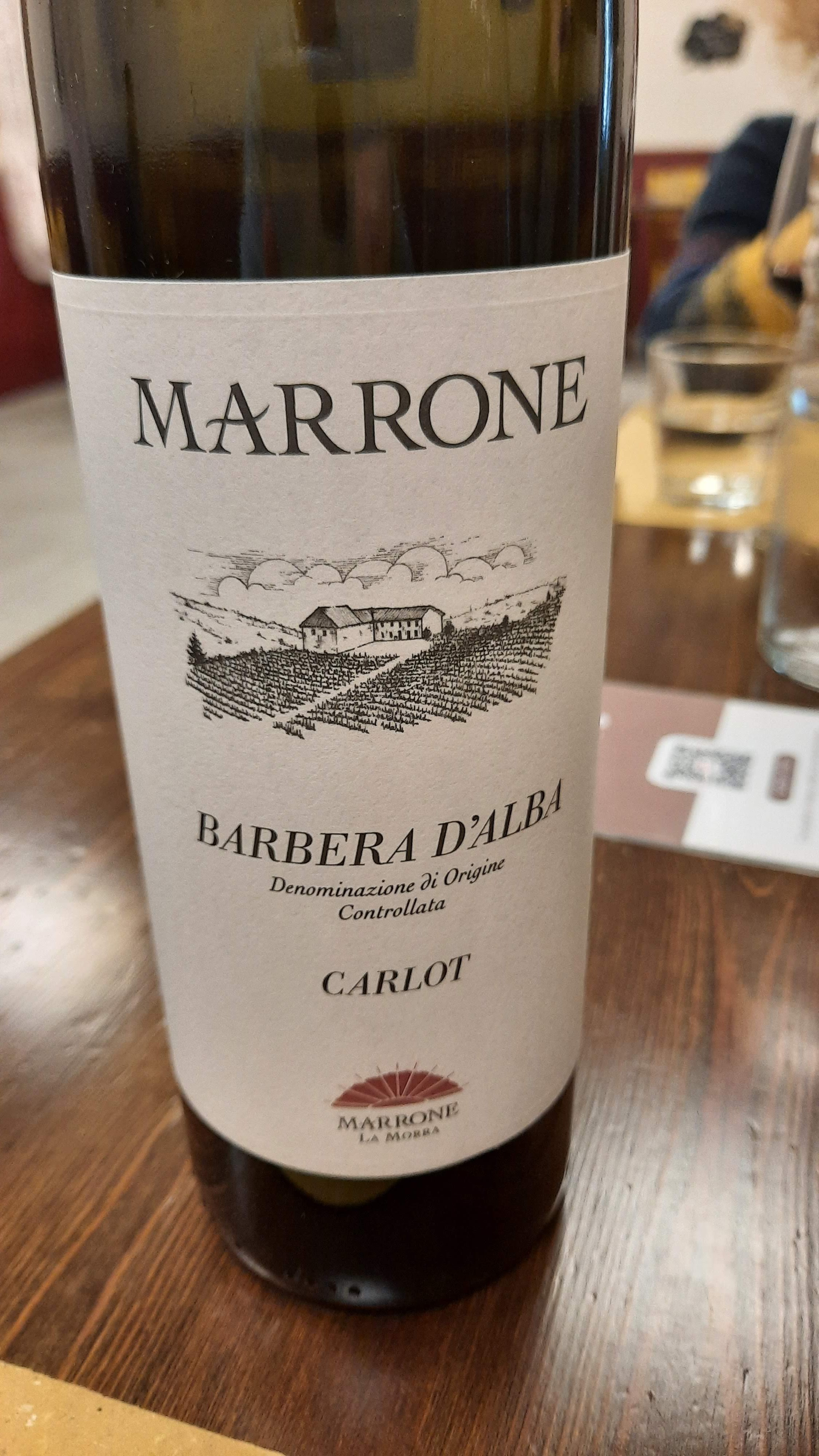 Barbera d’Alba Doc Carlot 2018 Az. Marrone, ottenuto interamente con uve di Barbera, affina per un periodo di 12 mesi in: barrique 60% di terzo passaggio e 40% in vasche di acciaio, si presenta nel calice con una bellissima tonalità rosso rubino intenso, all’olfatto libera eleganti sentori di mora, prugna, violetta e sottili note di spezie, e poi, tabacco e cacao, al palato è avvolgente e pieno, tannini setosi, un vino fine e dotato di una buona piacevolezza di beva. Lungo e duraturo.