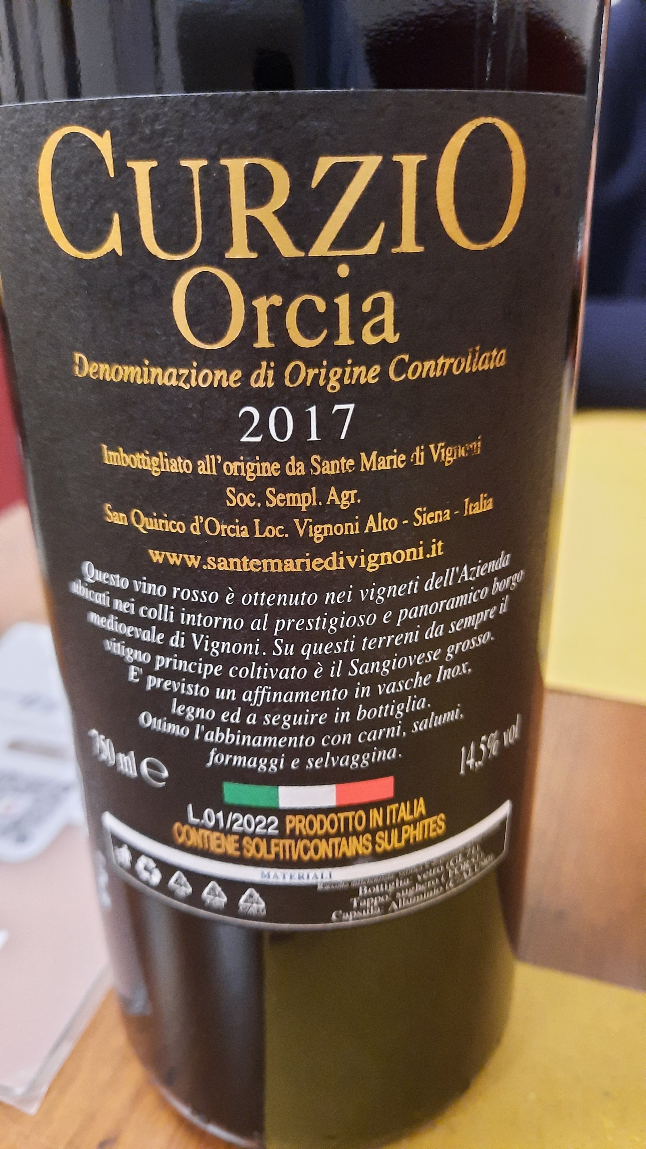Curzio Doc Orcia Rosso 2017 Az. Sante Marie di Vignoni, ottenuto interamente con uve di Sangiovese, affina per un periodo di circa 12 mesi in piccole botti di legno di rovere di Slavonia e prima di essere immesso sul mercato devono trascorrere dai 3 ai 6 mesi, a livello sensoriale: si presenta nel calice con un bellissimo colore rosso rubino vivace, accompagnato da una buona trasparenza e consistenza, all’olfatto emana eleganti sentori di violacciocca, ciliegia, sottobosco e pepe nero che ben si fondono con note boisè e balsamiche, al palato è piacevolmente morbido e sapido con chiusura piacevolmente fresca. Un vino pieno e soddisfacente, con tannini setosi, è dotato di una grande piacevolezza di beva. Ideale con pasta al ragù di carne, arrosti misti, carni rosse in genere e formaggi stagionati.