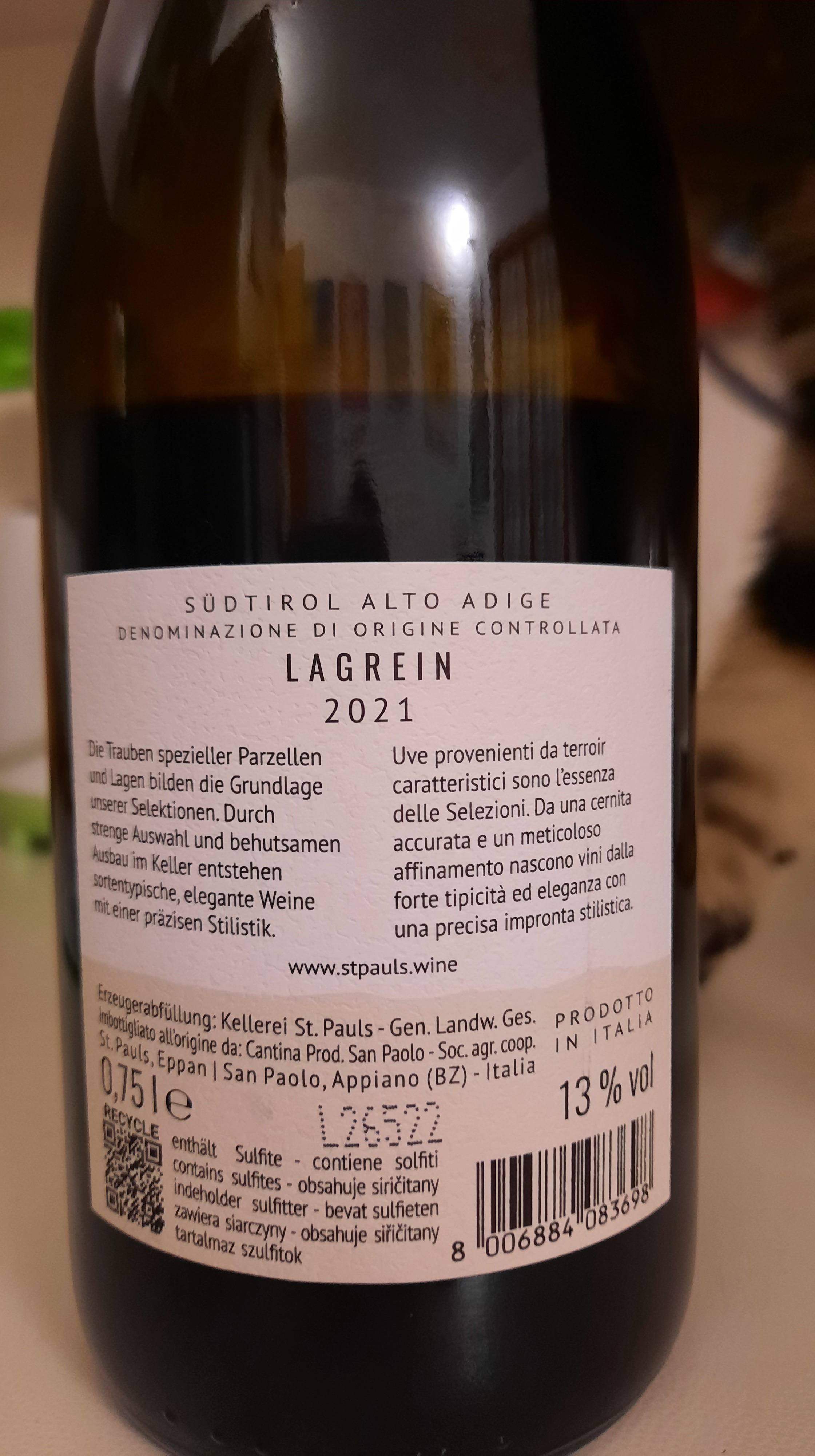 Zobl Lagrein Alto Adige Doc 2021 Az. St. Pauls, ottenuto interamente con uve dell’ omonimo e autoctono vitigno, vinificato e affinato in tonneaux, non di primo passaggio per un periodo di circa 6 mesi, si presenta nel calice con un bellissimo colore rosso rubino impenetrabile, al naso si percepiscono eleganti sentori di frutti di bosco, ciliegia, viola e cacao accompagnate da note di sottobosco e spezie dolci, al palato è piacevolmente tannico ed avvolgente, sapido e persistente. Lo vedo bene con preparazioni a base di selvaggina, brasati e formaggi stagionati.