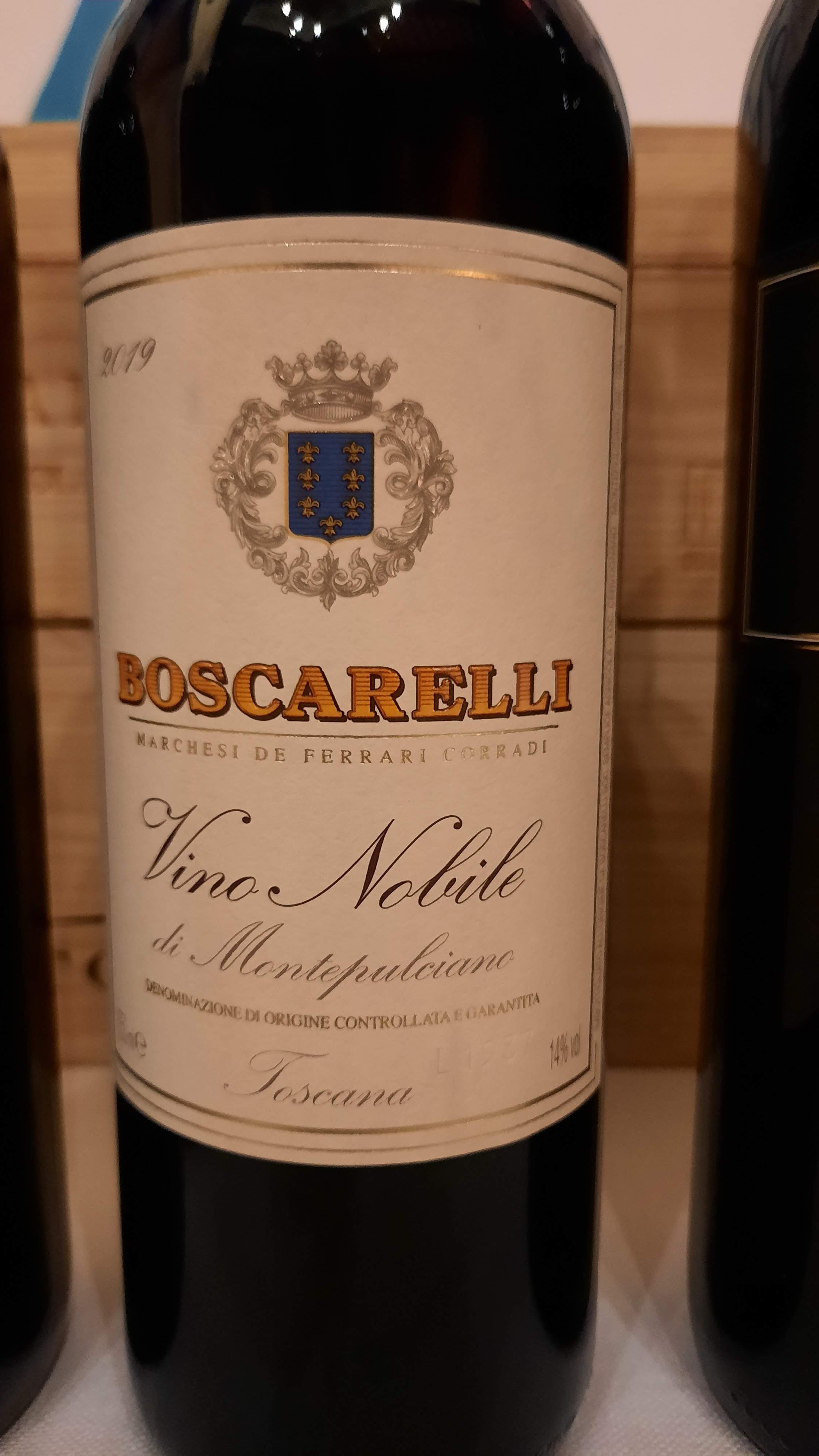 Vino Nobile di Montepulciano 2019 Az. Boscarelli, si presenta nel calice con un bellissimo colore rosso rubino trasparente e consistente, al naso sprigiona eleganti sentori di violetta, amarena, mirtillo, humus e tabacco che ben si integrano con nuances mentolate e balsamiche, il sorso è dotato di piacevole trama tannica ben sorretta da freschezza e in bocca rimane a lungo