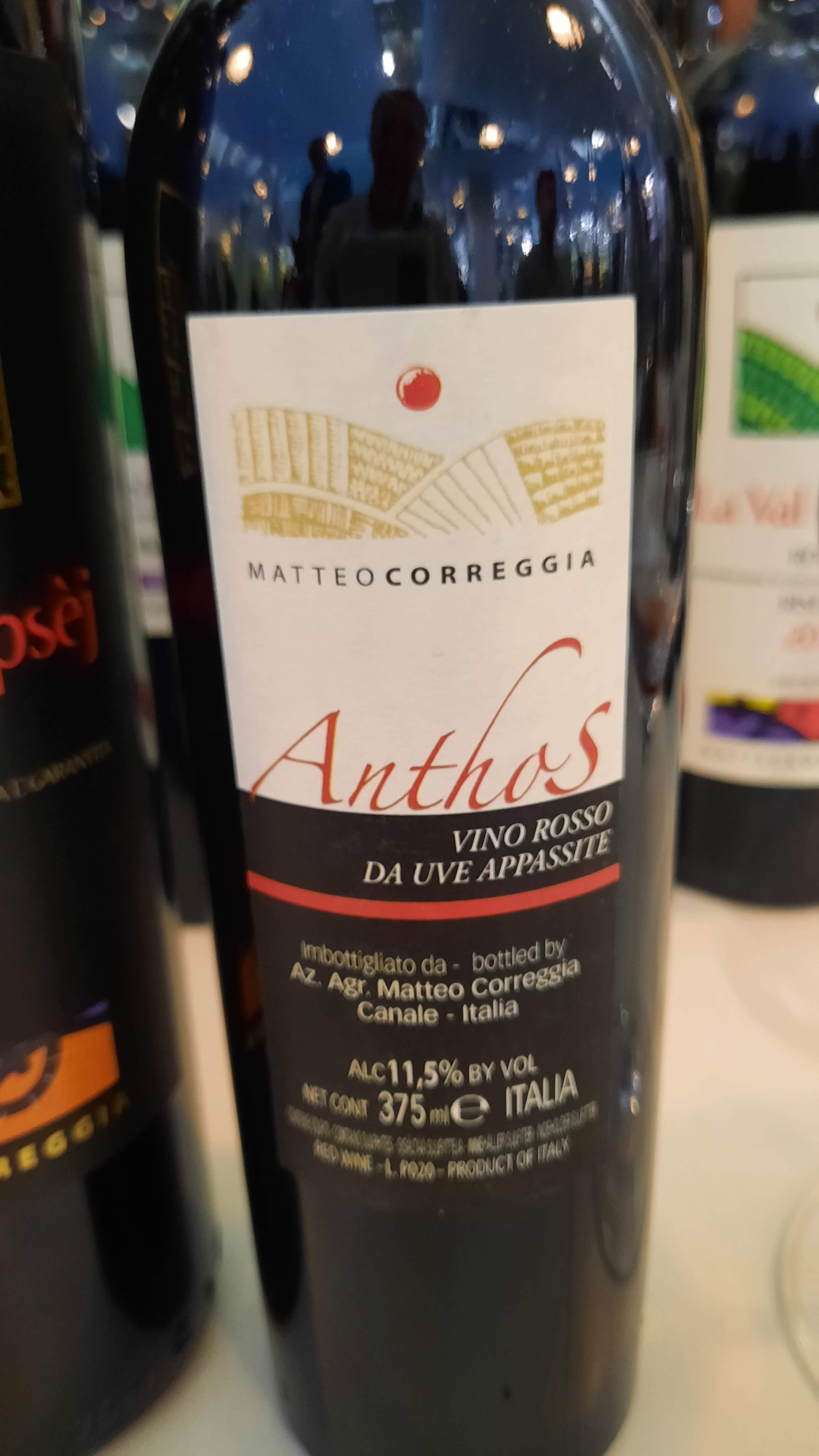 Anthos vino rosso da uve surmature, rosso rubino brillante, al naso si percepiscono sentori di fragola, ciliegia e lamponi, al palato è piacevolmente dolce e delizioso.