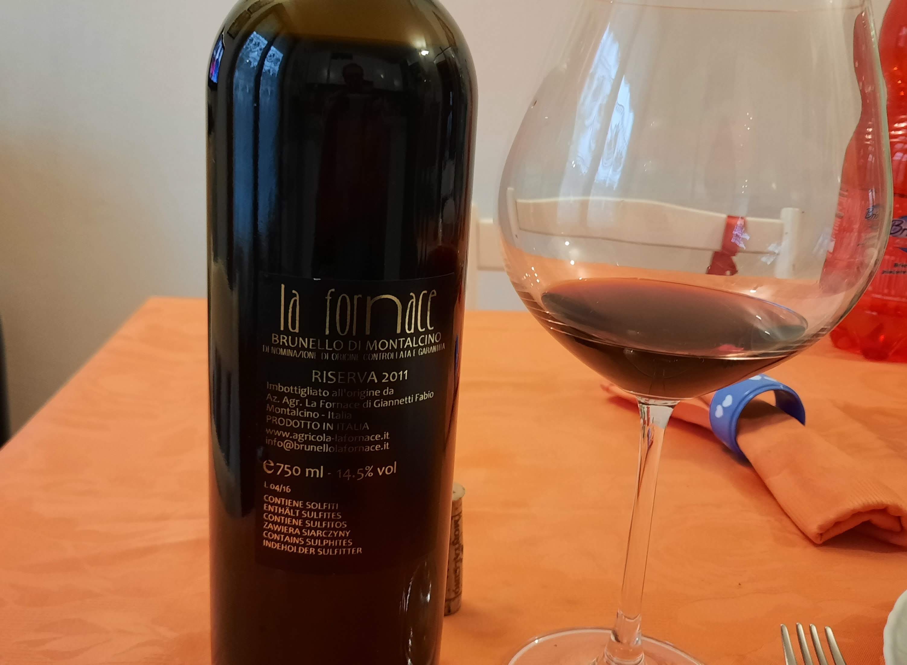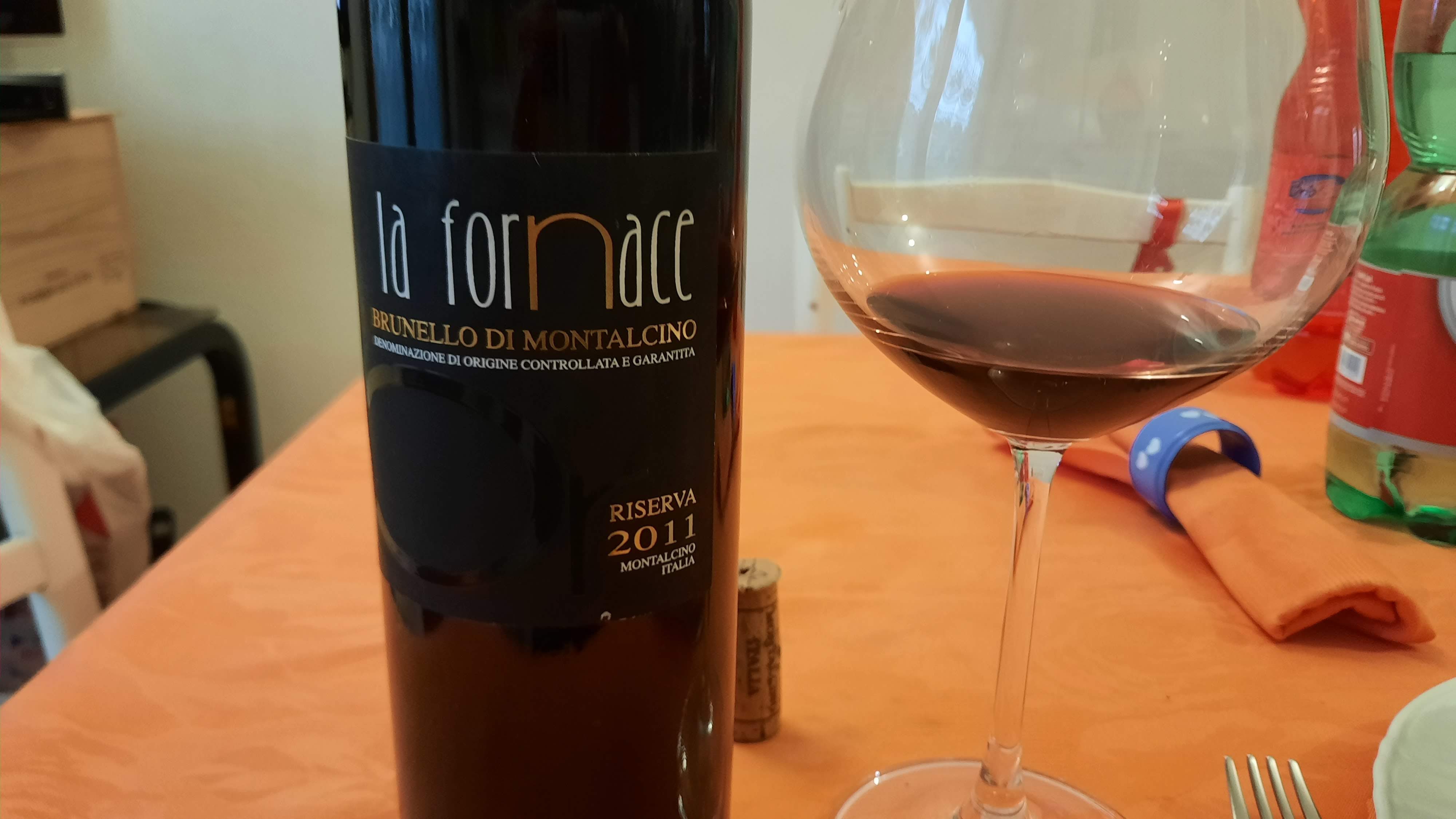 Brunello di Montalcino Riserva 2011 Az. La Fornace – Svela nel calice un bellissimo colore rosso granato intenso, trasparente e consistente, al naso sprigiona eleganti sentori di frutta rossa in confettura e sottobosco unite a piacevoli note di pepe nero, tabacco, cannella, vaniglia e cacao, al palato rivela una copiosa ma setosa trama tannica, è pieno ed aggraziato, un vino durevole e coerente .