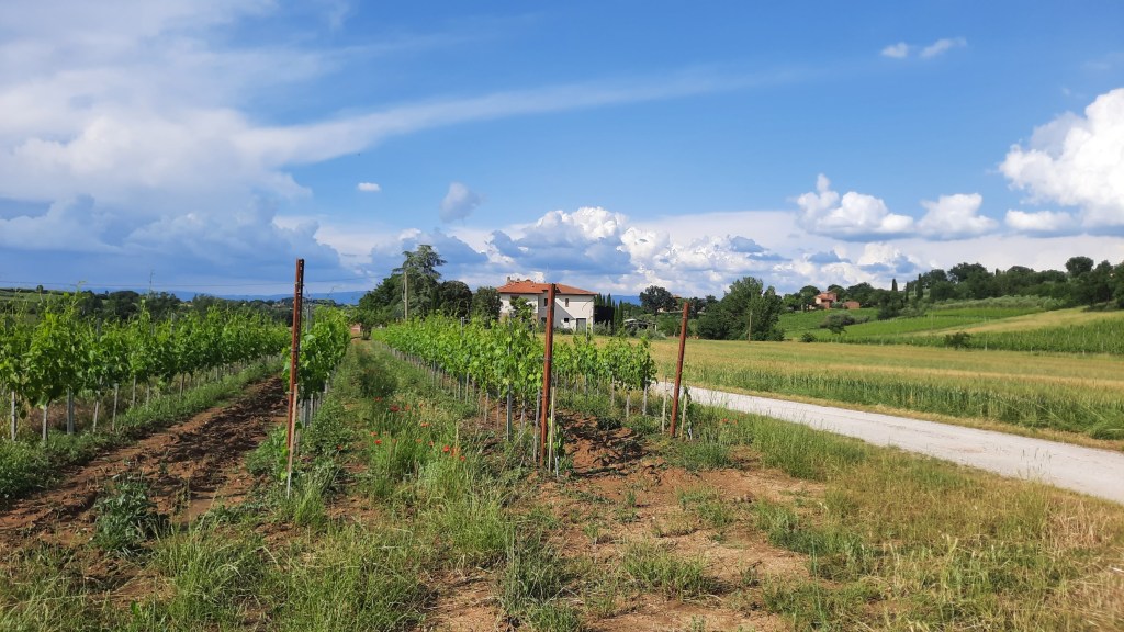 Al timone dell’azienda ci sono oggi gli esperti Massimiliano e Daniele Guidotti, rispettivamente agronomo ed enologo. L’ azienda vanta 20 ettari di terra, alcuni dei quali sono dedicati ad altre coltivazioni e coprono il fabbisogno del loro allevamento di bestiame della razza chianina. Nella nuova cantina oltre a botti di legno di varie dimensioni e contenitori in acciaio, vi sono un buon numero di vasche in cemento che raggiungono il mezzo secolo di età, le quali sono state trasferite dalla vecchia cantina. Ho scoperto i loro vini recentemente e devo dire di averli apprezzati molto, pertanto ho colto l’occasione per recarmi in azienda assieme al collega Antonio Caprara.
