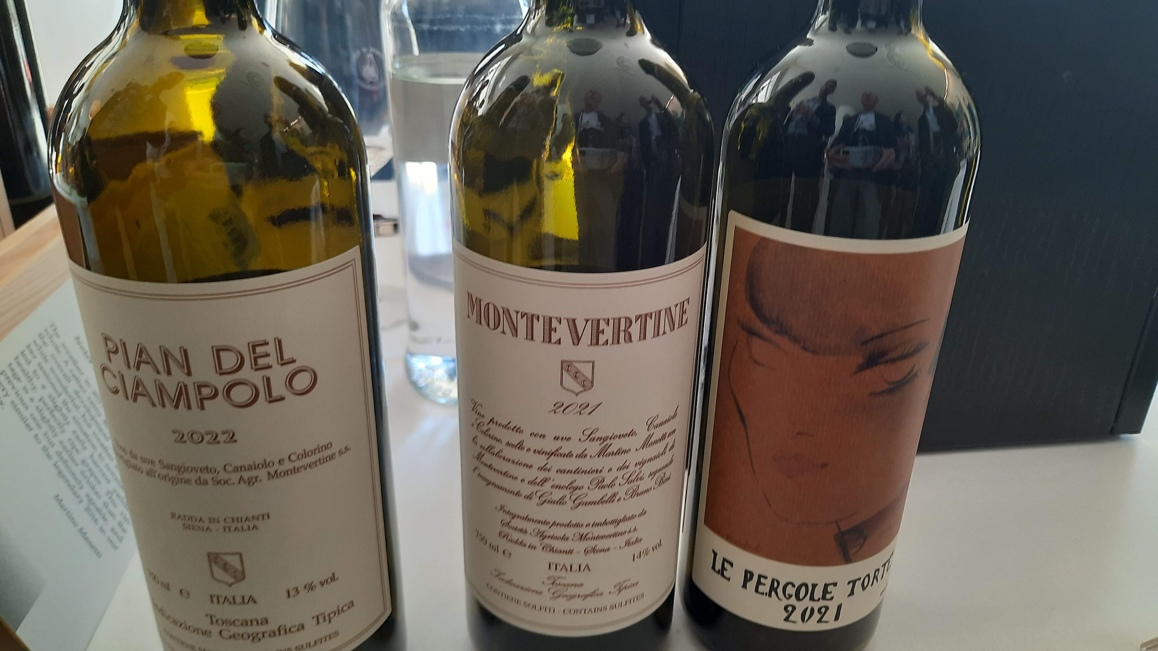 Montevertine 2021, ottenuto con 90% Sangiovese, 5% Canaiolo e 5% Colorino – Si presenta nel calice con un bellissimo colore rosso rubino, trasparente, al naso emana sentori di lampone, ribes e ciliegia, accompagnate da nuances speziate di ginepro, il sorso è pieno ed appagante, ben equilibrato. Gran bel vino.