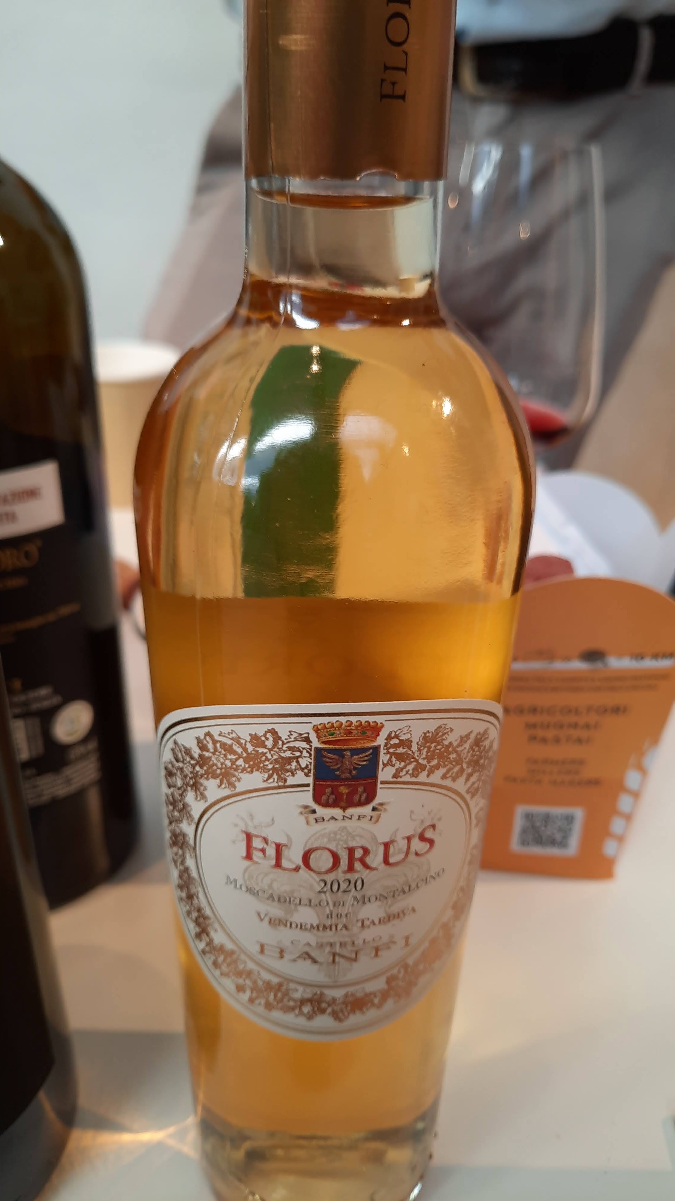 Moscadello di Montalcino Doc Vendemmia Tardiva Florus 2020 Castello Banfi – Giallo dorato luminoso, rimanda sentori di, zagara, arancia candita, albicocca e miele, al palato è ben equilibrato con dolcezza e freschezza, rimane in bocca a lungo.