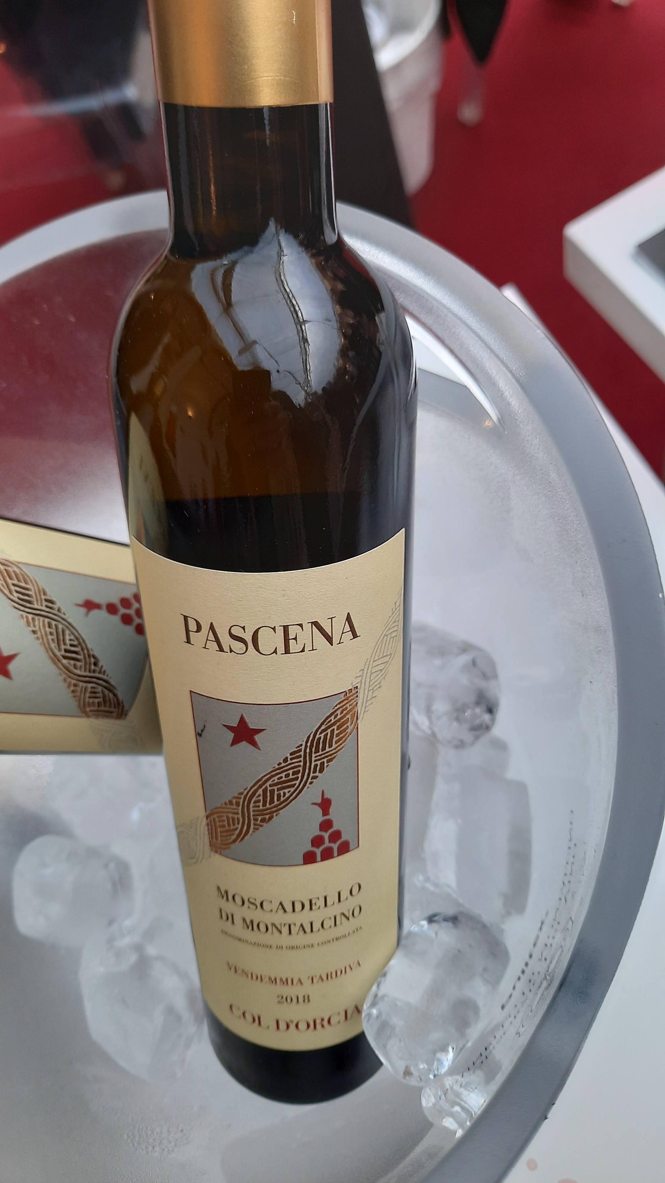 Moscadello di Montalcino Doc Vendemmia Tardiva Pascena 2018 Col d’Orcia – Giallo oro antico, rivela sentori di rosa bianca, pesca, albicocca, agrumi canditi e zafferano, al palato risulta fresco, dolce, armonico e corrispondente