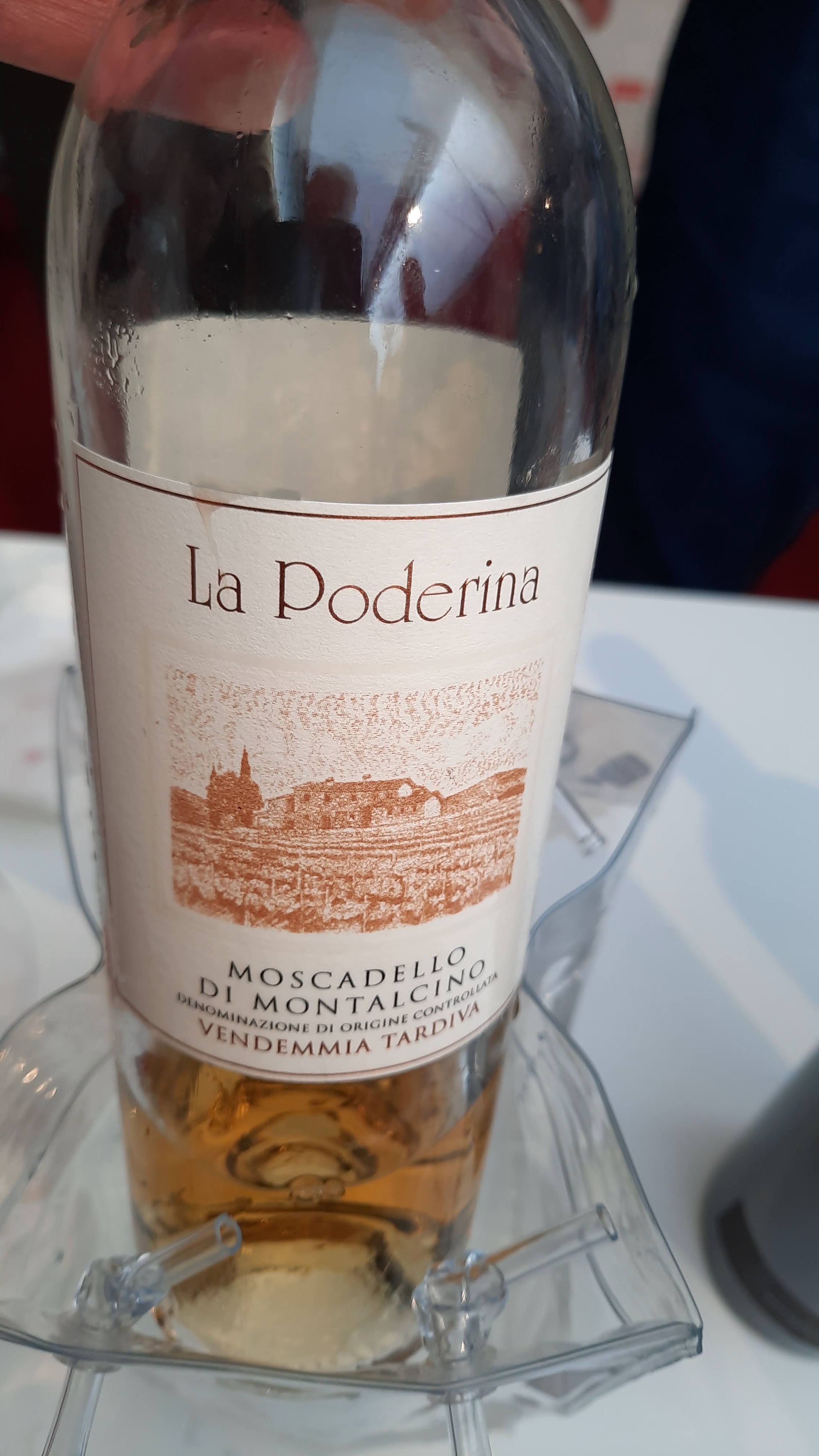 Moscadello di Montalcino Doc Vendemmia Tardiva La Poderina – Giallo dorato brillante, sprigiona sentori di datteri, fichi secchi, scorza d’arancia candita e spezie dolci, il sorso è piacevolmente dolce, saporito e persistente.