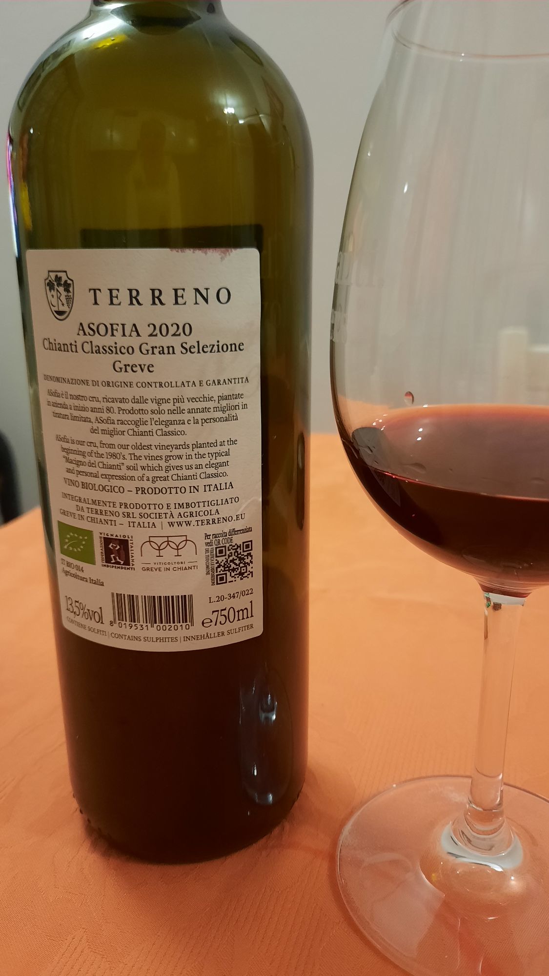 Chianti Classico Gran Selezione ASofia 2020 Az. Terreno – Ottenuto con Sangiovese in purezza, le cui uve provengono dal vigneto più vecchio dell’azienda. Affina in botti di rovere per un periodo minimo di 30 mesi e successivamente per un anno in bottiglia prima di essere posto in commercio. A livello sensoriale, si presenta nel calice con un bel colore rosso rubino intenso e trasparente, all’olfatto emana piacevoli note di ciliegia, mirtillo, mora, prugna, tabacco e liquirizia, scivola in bocca vellutato, setoso e armonioso, è dotato di una lunghissima persistenza aromatica.