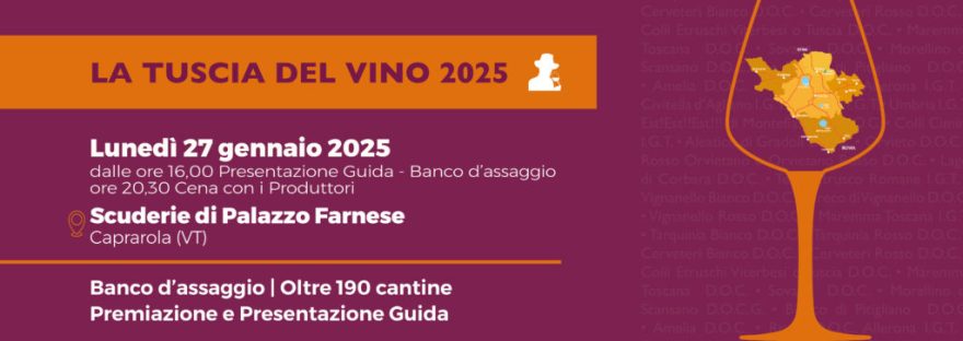 | La Tuscia del Vino 2025 Lunedì 27 gennaio 2025 a Caprarola (VT) presentazione e grande degustazione In uscita La Tuscia del Vino 2025 a cura di Carlo Zucchetti e Francesca Mordacchini Alfani. Verrà presentata con una grande degustazione lunedì 27 gennaio 2025 alle Scuderie di Palazzo Farnese a Caprarola. Un’imperdibile occasione per scoprire il territorio enoico della Tuscia con le sue 196 cantine, assaggiare gli oltre 1.000 vini e non solo, parlare con i produttori, conoscere nuove realtà. Una grande degustazione che vedrà sui banchi d’assaggio oltre 196 cantine degustate e recensite in guida con una scelta dei propri vini. Grande novità della presentazione sarà la cena che seguirà l’evento preparata a più mani dagli chef del territorio con i vini della guida in abbinamento. Quando: lunedì 27 gennaio 2025 Dove: Scuderie di Palazzo Farnese a Caprarola (VT) Orari: ore 16,00 presentazione e consegna dei premiModera Francesco Corsi, giornalista, direttore www.carlozucchetti.itOre 17,00 – 20,00 apertura dei banchi d’assaggioOre 20,30 cena a più mani in compagnia dei produttoriCosto:€ 12,00 Ingresso con guida omaggio € 5,00 Ingresso per associazioni Sommelier e soci Slow Food (€ 10,00 con guida) presentando la tessera. € 10,00 Guida prezzo speciale presentazioneGratuito per stampa e operatori previo accredito scrivendo a redazione@carlozucchetti.it Info: latusciadelvino@carlozucchetti.com |