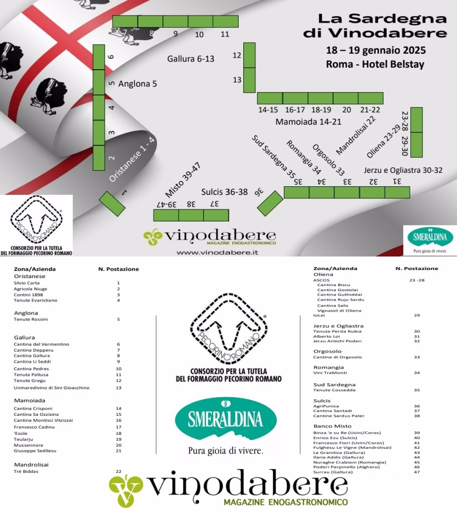 Sabato 18 e domenica 19 gennaio, all’Hotel Belstay a Roma, sarà possibile incontrare ai banchi di assaggio numerosi viticoltori sardi (47 aziende), in rappresentanza delle tante aree (vere e proprie sub-regioni) dove si produce vino di qualità. Tra più di 200 referenze tra bianchi, rosati, rossi, vini dolci e ossidativi, e perfino bollicine, ci si potrà orientare per apprezzare, come merita, la ricchezza enologica della Sardegna, conoscere i vignaioli che la animano e sperimentare nel calice lo stato dell’arte della viticoltura sarda, giunta ormai a livelli di indiscutibile eccellenza.