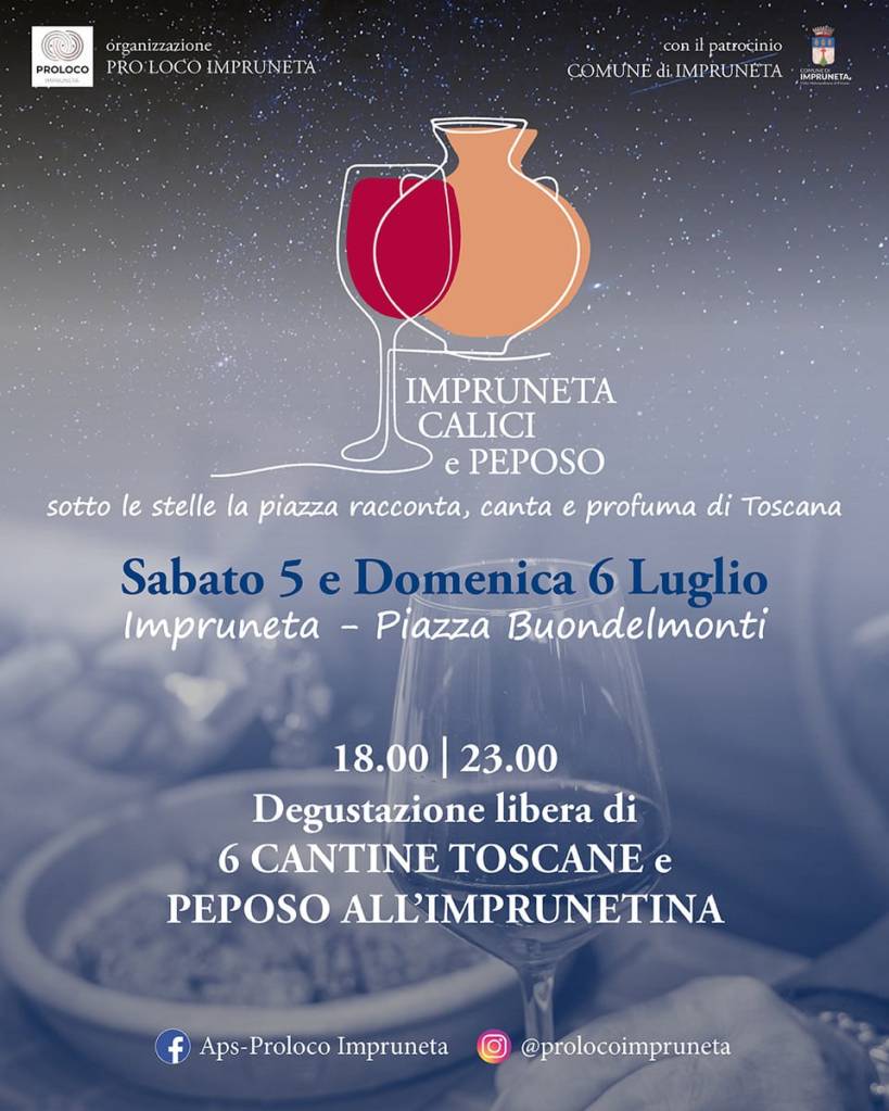 L’evento “Impruneta Calici e Peposo” è organizzato dalla Pro Loco di Impruneta, con il patrocinio del Comune di Impruneta, e rientra nel programma estivo di iniziative che si svolgono nel centro storico del paese fino a settembre.