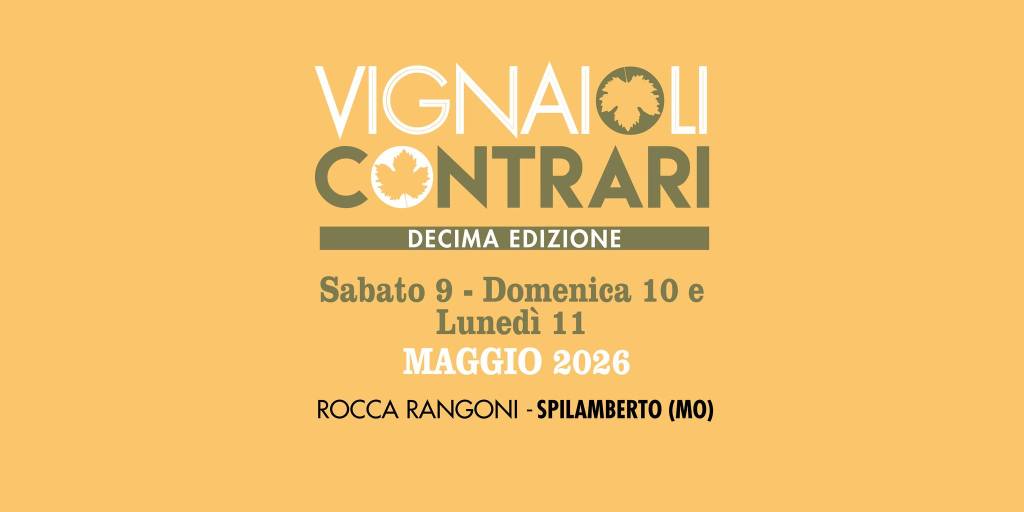 Dal 9 all’ 11 maggio 2026 a Spilamberto torna la decima edizione di Vignaioli Contrari. Si svolgerà nella suggestiva Rocca Rangoni di Spilamberto (Mo). Saranno presentioltre 60 produttori provenienti da ogni regione italiana e dalla vicina Slovenia. Le etichette in degustazione sono ottenute rigorosamente con uve da varietà autoctone. La kermesse è patrocinata da: Regione Emilia Romagna, Comune di Spilamberto, Unione Terre di Castelli, e vede la partecipazione dell’Ordine del Nocino Modenese e della Consorteria dell’Aceto Balsamico Tradizionale di Modena. Cloud wine9 informa i propri lettori, come sempre sperando di farvi cosa gradita. Save the date. Per ogni dettaglio potete visitare il sito dedicato: https://www.vignaiolicontrari.it/